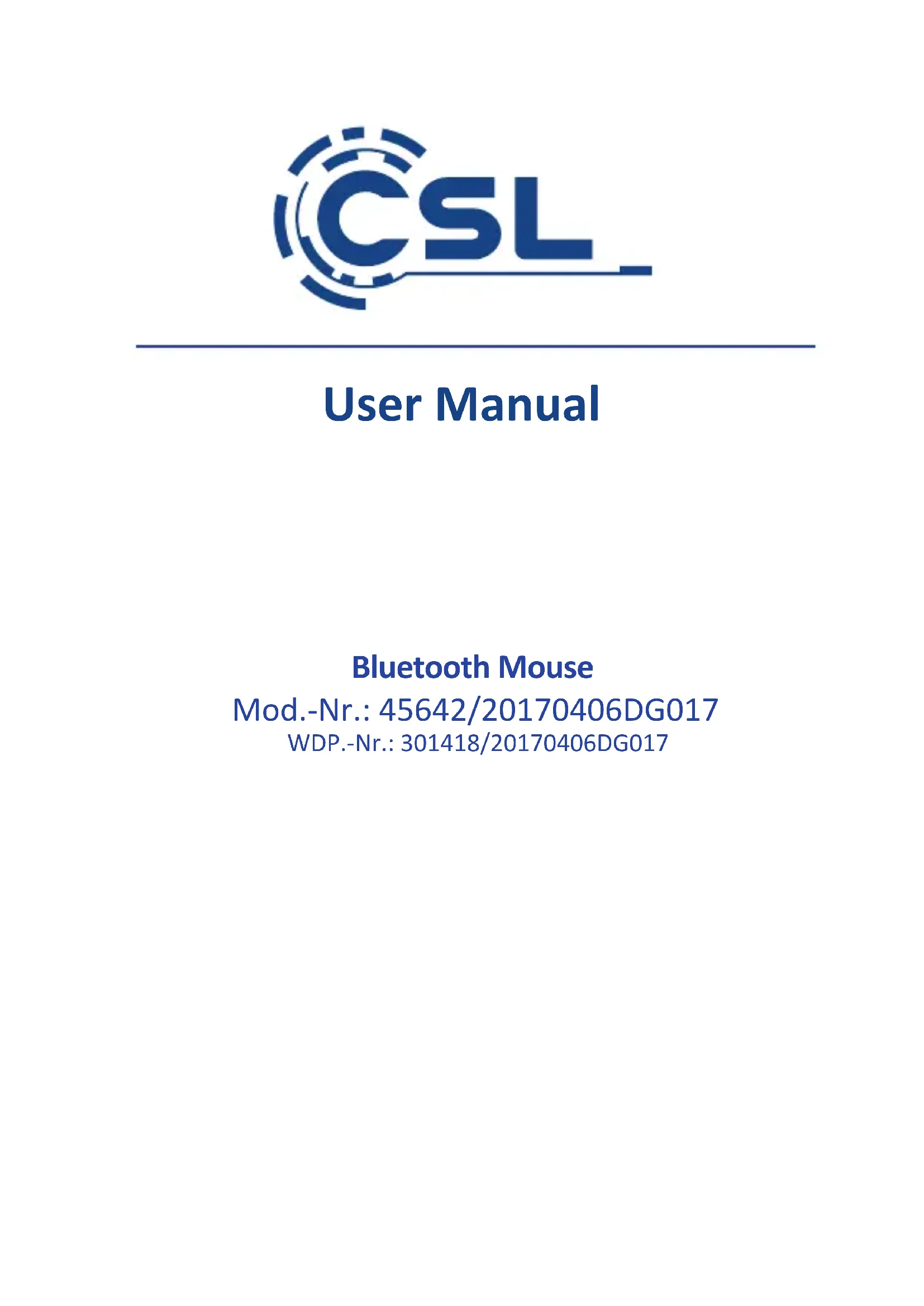 115Français Indicaon pour l'emploi de piles rechargeables: En raison de la faible tension d'accumulateur de seulement 1.2 V, le fonconne- ment de la souris ne peut pas être garan avec chaque type de baeries. Des dysfonconnements tels que des sauts du pointeur de souris ou une durée de vie raccourcie de l'accumulateur sont aussi possibles. Nous recommandons l'ulisaon de baeries 1.5 V. Fermez le comparment de baeries et glissez l'interrupteur sur la face inférieure sur la posion « MARCHE ». La souris est opéraonnelle. 5 Connexion par Bluetooth Assurez-vous d'abord que le disposif est hors tension. Meez le disposif en marche avec l'interrupteur « on/o » en posion « on ». Vous devez ensuite appuyer sur la touche Couplage sur la face inférieure jusqu'à ce que la LED sur la face supérieure bleue s'allume. Le mode de couplage est acvé. Acvez le Bluetooth sur l'appareil auquel vous souhaitez connecter la souris. Pro- cédez ensuite à une recherche et connectez l'appareil « CSL-45642 ». Il peut s’arriver que dans le couplage un code vous soit demandé. Dans ce cas, le code de couplage est le « 0000 ».16 Français Aenon: Le mode de connexion par Bluetooth est désacvé pour des raisons de sécurité, si aucune connexion n'a été établie après plusieurs minutes. Veuillez suivre les étapes décrites ci-dessus une seconde fois si la connexion a échoué. 6 Consignes de sécurité et exclusion de responsabilité Veuillez ne jamais essayer d’ouvrir l’appareil an de procéder à des réparaons ou des transformaons de votre propre iniave. Évitez tout contact avec les ten- sions secteur. L’appareil n’est hors tension que si la prise murale est débranchée. Ne court-circuitez en aucun cas le produit. En outre, n’oubliez pas de débrancher intégralement la prise murale en cas de non-ulisaon ou d’orage. L’appareil ne doit pas être ulisé en extérieur. Il convient donc de l’uliser exclusivement dans des locaux secs. Protégez-le contre une humidité relave élevée, l’eau et la neige. Éloignez impéravement l’appareil de températures extérieures élevées. Ne soumeez pas l’appareil à des variaons subites de température ou à de fortes vibraons car les composants électroniques. Avant l’ulisaon, vériez que l’ap- pareil ne présente pas de dommages. L’appareil ne doit pas être ulisé s’il a reçu un coup ou s’il a été endommagé d’une autre manière. Veuillez également respec- ter les disposions et limitaons naonales en vigueur. N’ulisez pas cet appareil à d’autres ns que celles décrites dans le présent guide. Ce produit n’est pas un jouet. Tenez-le hors de portée des enfants et des personnes aeintes de troubles mentaux. Ulisez l’appareil avec le socle fourni exclusivement. Les réparaons ou modicaons apportées à l’appareil par une personne autre que le fournisseur d’origine rendent les droits à garane ou réclamaon caduques. L’appareil doit exclusivement être ulisé par des personnes ayant lu et compris le présent guide. Les spécicaons de l’appareil peuvent changer sans préavis spéci- que. L’appareil doit exclusivement être ulisé par des personnes ayant lu et com- pris le présent guide. 7 Consignes concernant le recyclage Les appareils électriques et électroniques ne doivent pas être jetés dans les ordures ménagères conformément à la direcve européenne DEEE. Leurs composants doivent être recyclés ou revalorisés séparément, car des composants toxiques ou dangereux pourraient causer des dommages durables à l’environnement en cas de recyclage non conforme.17Français Par la présente, la société WD Plus GmbH déclare que l’appareil 45642/20170406DG017 est conforme aux exigences essenelles et aux autres disposions pernentes de la Direcve 1999/5/CE. Pour obtenir une déclaraon de conformité dans son intégralité, contactez: WD Plus GmbH, Wohlenbergstraße 16, 30179 Hanovre Direcve DEEE: 2012/19/EU EUN° d’enregistrement DEE: 94495668 En tant que consommateur, vous êtes tenu de retourner gratuitement les appareils électriques et électroniques arrivés en n de vie à leur fabricant, à leur lieu de vente ou à des points de collecte publics prévus à cet eet conformément à la loi allemande relave aux appareils électriques. Le droit naonal compétent règle les détails à cet égard. Le symbole sur le produit, la noce d’ulisaon et/ou l’embal- lage renvoie vers ces direcves. Grâce à cee séparaon des maères, à la revalo- risaon et au recyclage d’appareils usagés, vous contribuez de manière essenelle à la protecon de notre environnement. 8 Consignes concernant le recyclage des piles En relaon avec la vente de piles ou la livraison d’appareils contenant des piles, le fournisseur est tenu de faire remarquer les éléments suivants à l’acheteur: Le client est légalement tenu à la restuon des piles usagées en sa qualité d’ulisateur nal. Il peut retourner les piles usagées que le fournisseur présente ou a présenté dans son assorment gratuitement au dépôt d’expédion (adresse d’expédion) du fournisseur. Les symboles représentés sur les piles ont les signicaons sui- vantes : Pb = la pile conent plus de 0,004 % en masse de plomb, Cd = la pile conent plus de 0,002 % en masse de cadmium, Hg = la pile conent plus de 0,0005 % en masse de mercure. Le symbole de poubelle écrasée signie qu’il est interdit de jeter la pile dans les ordures ménagères.18 Español Muchas gracias por haberse decidido por un producto de CSL. Para que pueda disfrutar durante mucho empo del disposivo adquirido, le recomendamos que lea atentamente las siguientes instrucciones. 1 Volumen de suministro