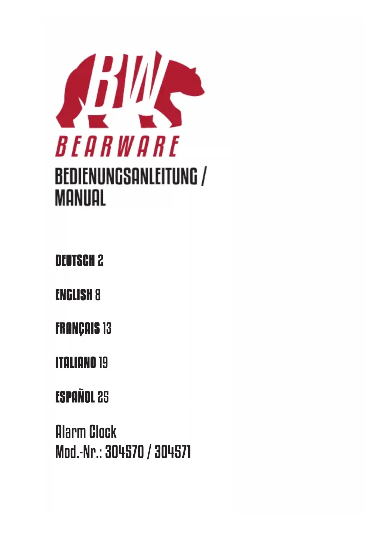En relaon avec la vente de baeries ou de la livraison d'appareils contenants des baeries, le fournisseur est obligé d'informer le client sur les points suivants : Le Client est légalement tenu, en tant qu'ulisateur nal, de restuer les baeries usagées. Il peut restuer gratuitement à l'entrepôt d'expédion (adresse d'expé- dion) du fournisseur des baeries usagées que le fournisseur ore ou a oert comme piles neuves dans son assorment. Les symboles gurant sur les baeries ont les signicaons suivantes : Pb = la baerie conent plus de 0,004 % en poids de plomb, Cd = la baerie conent plus de 0,002 % en poids de cadmium, Hg = la baerie conent plus de 0,0005 % en poids de mercure.18 Français La société WD Plus GmbH déclare par la présente que les appareils 304570 et 304571 sont conformes aux exigences fondamentales et aux autres disposions pernentes de la direc- ve. Pour obtenir une déclaraon de conformité complète, adressez-vous à : WD Plus GmbH, Wohlenbergstraße 16, 30179 Hanovre Direcve DEEE 2012/19/UE Numéro de registre DEEE : DE 67896761 Le symbole de la poubelle barrée signie que la baerie ne doit pas être éliminée avec les ordures ménagères.19Italiano Grazie per aver scelto un prodoo di BEARWARE. Per ulizzare con soddisfazione l'apparecchio acquistato, si prega di leggere aentamente le seguen brevi istru- zioni per l’uso.