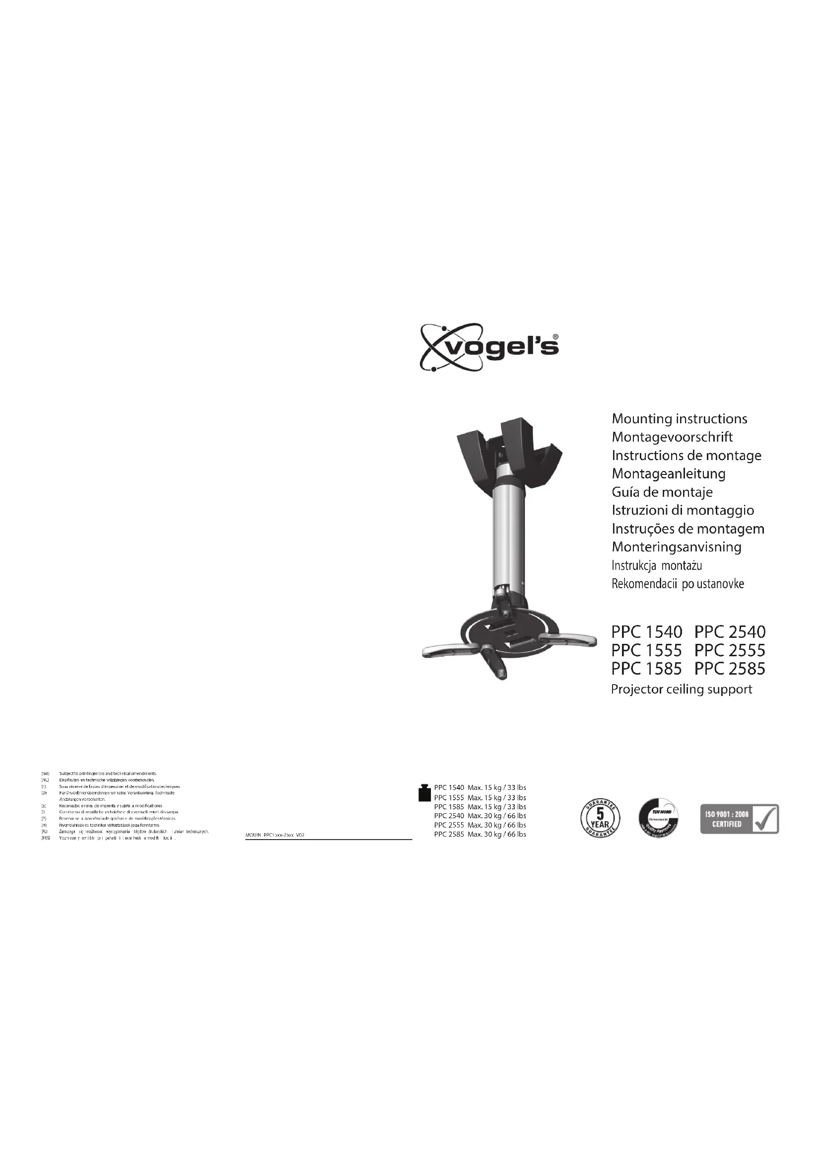 Le Vogel's PPC 1540 est couvert par une garantie de 5 ans contre les défauts de fabrication. Conservez votre reçu pour faire valoir la garantie.