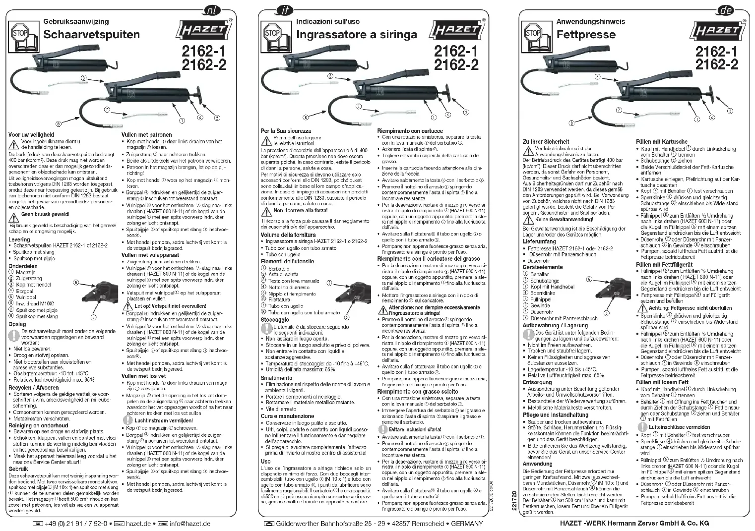 Cette pression ne doit pas être dépassée. Dans le cas contraire, il existe des risques de blessures graves et de dommages matériels. Pour des raisons de sécurité, assurez-vous que les accessoires soient conformes à la norme DIN 1283. Si des accessoires non-conformes à cette norme sont utilisés, il existe des risques de blessures graves et de dommages matériels. Evitez forte pression ! En cas de forte pression, il existe des risques d’endommagement du roulement et/ou de l’appareil. Eléments de l’appareil• Graisseur HAZET 2162-1 ou 2162-2 Bec avec tuyau renforcé• BecEléments de l’appareil Corps Tige à poussée Tête avec levier Gâchette d’arrêt Embout de remplissage Raccord fileté Bec Bec avec tuyau renforcéStockage / DépôtLe graisseur doit être stocké selon les conditions décrites ci-après :• Ne pas stocker en plein air.• Stocker dans un endroit sec et libre de poussière.• Ne pas exposer aux liquides ou aux substances agressives.• Température de stockage -10 à +45°C.• Humidité relative de l’air 65%.Mise au rebut• Mise au rebut selon les lois sur la protection de l’environnement et sur la sécurité au travail• Les pièces détachées peuvent être recyclées.• Mettez les pièces métalliques au rebut.Entretien et maintenance• Garder dans un endroit sec et propre.• Ne pas laisser tomber et ne pas exposer aux chocs et aux liquides parce qu’ils peuvent nuire au fonctionnement et endommager l’instrument.• Veuillez vider l’outil complètement avant de l’envoyer à notre centre de service !Utilisation L’utilisation des graisseurs exige peu de force. Grâce aux embouchures interchangeables, au bec
