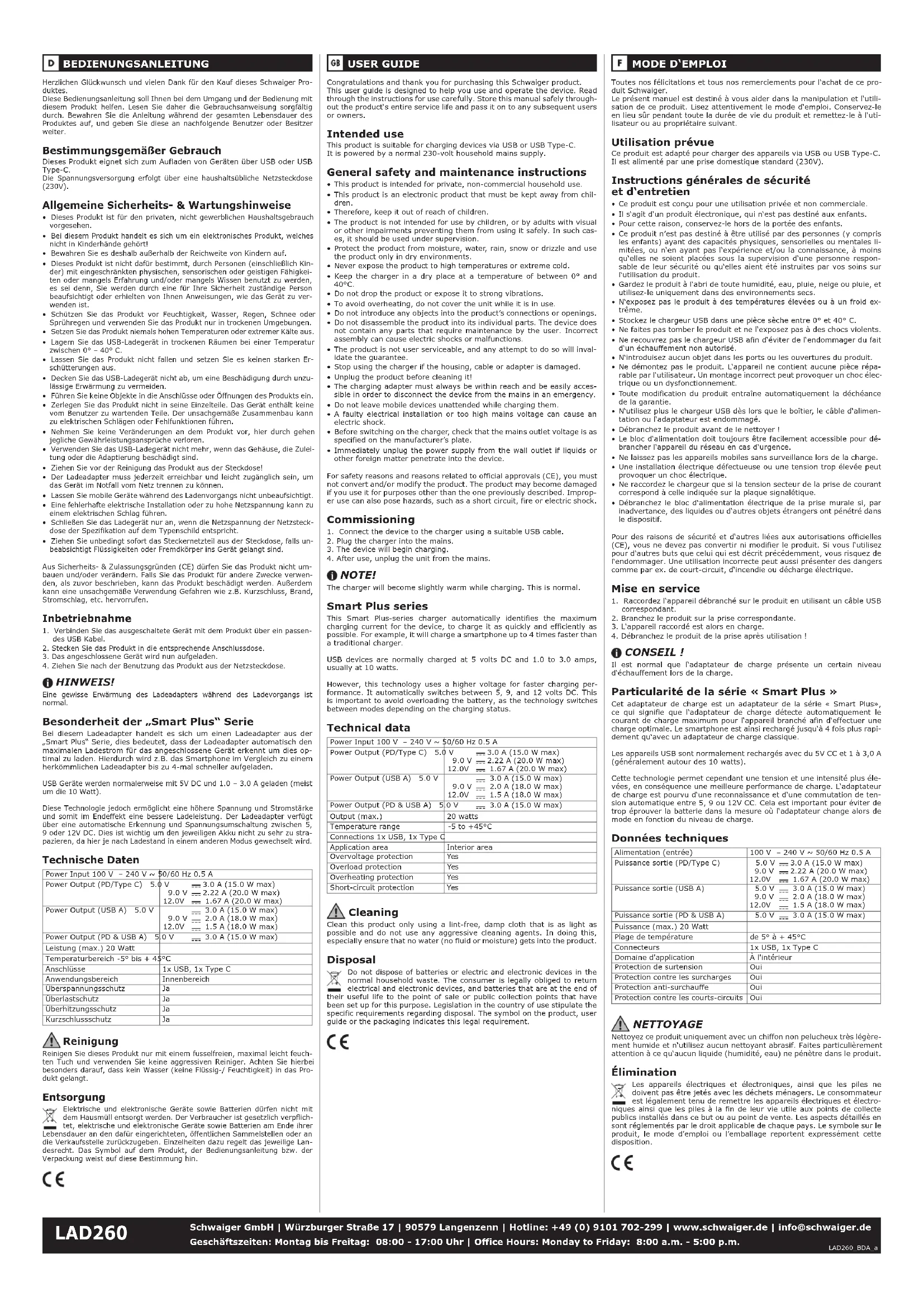 Puissance (max.) 20 Watt Plage de température de 5° à + 45°C Connecteurs 1x USB, 1x Type C Domaine d'application À l'intérieur Protection de surtension Oui Protection contre les surcharges Oui Protection anti-surchauffe Oui Protection contre les courts-circuits Oui NETTOYAGE Nettoyez ce produit uniquement avec un chiffon non pelucheux très légère- ment humide et n‘utilisez aucun nettoyant abrasif. Faites particulièrement attention à ce qu‘aucun liquide (humidité, eau) ne pénètre dans le produit. Élimination Les appareils électriques et électroniques, ainsi que les piles ne doivent pas être jetés avec les déchets ménagers. Le consommateur est légalement tenu de remettre les appareils électriques et électro- niques ainsi que les piles à la fin de leur vie utile aux points de collecte publics installés dans ce but ou au point de vente. Les aspects détaillés en sont réglementés par le droit applicable de chaque pays. Le symbole sur le produit, le mode d’emploi ou l’emballage reportent expressément cette disposition. Congratulations and thank you for purchasing this Schwaiger product. This user guide is designed to help you use and operate the device. Read through the instructions for use carefully. Store this manual safely through- out the product‘s entire service life and pass it on to any subsequent users or owners. Intended use This product is suitable for charging devices via USB or USB Type-C. It is powered by a normal 230-volt household mains supply. General safety and maintenance instructions
