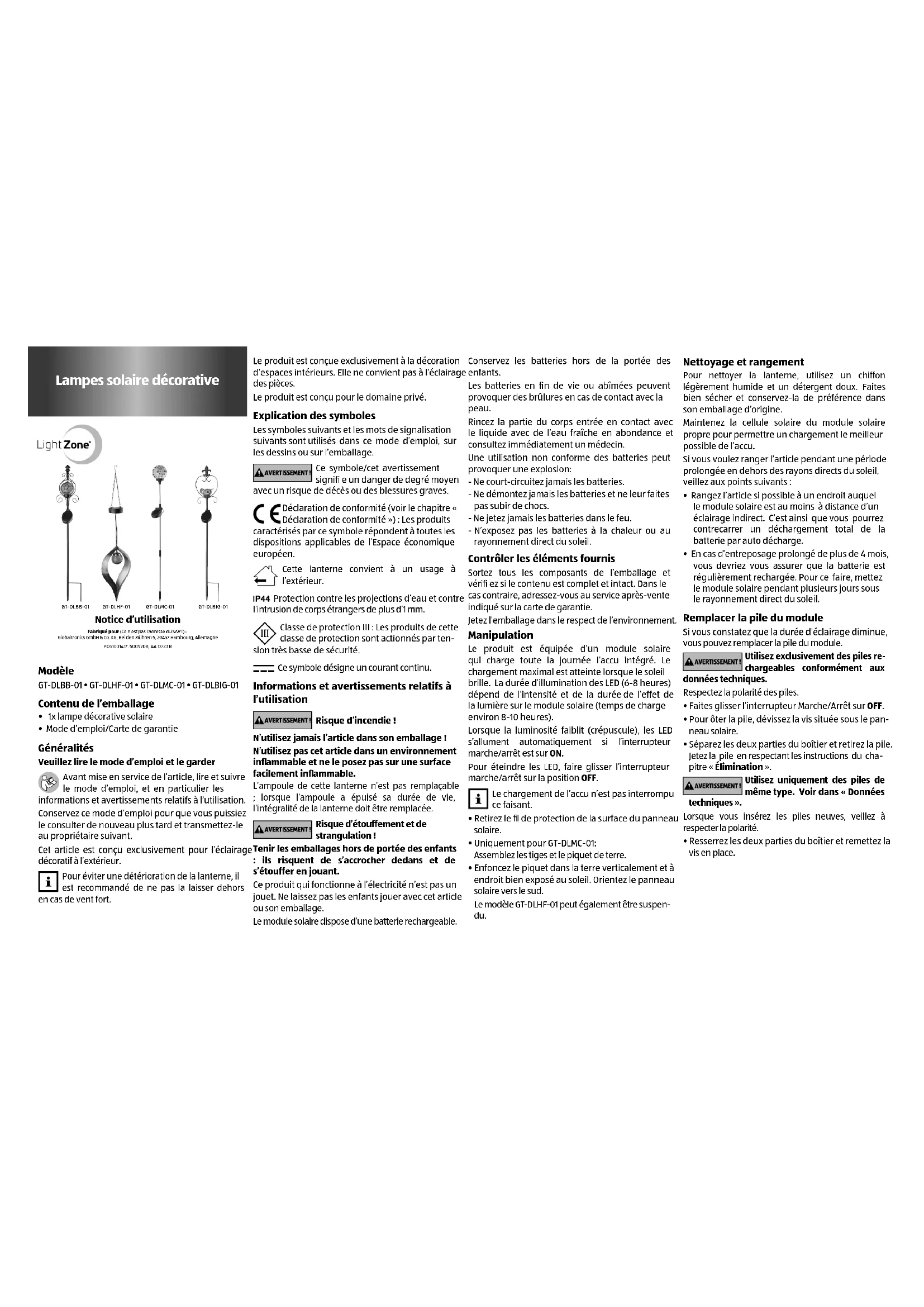 - Resserrez les deux parties du boîtier et remettez la vis en place. Lampes solaire décorative Notice d’utilisation Fabriqué pour (Ce n’est pas l’adresse du SAV !) :Globaltronics GmbH & Co. KG, Bei den Mühren 5, 20457 Hambourg, AllemagnePO51031417, 5009208, AA 17/23 B GT-DLBB-01 GT-DLMC-01 GT-DLBIG-01GT-DLHF-01Élimination Éliminer l’emballage Triez l’emballage avant de l’éliminer. Déposez le pa- pier et carton au point de ramassage du papier, les fi lms au point de collecte des matières recyclables. Mise au rebut de l’appareil usagé Les appareils usagés ne doivent pas être je- tés avec les déchets ménagers! Le symbole de la poubelle barrée signifi e que les appareils électriques et électroniques ne doivent jamais être jetés dans la poubelle des ordures mé- nagères. Les consommateurs sont contraints par la loi de jeter les appareils électriques et électroniques arrivés en fi n de vie, séparément des déchets mé- nagers non triés. Cela permettra de garantir une va- lorisation des déchets respectueuse de l’environne- ment et des ressources. Les batteries et accumulateurs qui ne sont pas fi xés dans l’appareil électrique ou électronique et qui peuvent être extraits sans dommage, doivent être retirés de l’appareil avant de l’emmener dans un point de collecte et éliminés de manière appro- priée. Cela s’applique également aux ampoules qui peuvent être extraites de l’appareil sans dommage. Les propriétaires privés d’appareils électriques et électroniques peuvent les déposer dans des déchet- teries municipales ou les déposer dans les points de collecte mis en place par les fabricants ou les reven- deurs. Le dépôt d’appareils usagés est gratuit. D’une manière générale, les revendeurs sont tenus de proposer un service gratuit de reprise des appa- reils usagés, en mettant à disposition des points de collecte appropriés, à une distance raisonnable. Les consommateurs ont la possibilité de déposer gratuitement un appareil usagé auprès d’un reven- deur soumis à l’obligation de reprendre ces appa- reils, lorsqu’ils achètent un appareil neuf équiva- lent, offrant globalement les mêmes fonctions. Cette possibilité est aussi offerte pour les livraisons à un ménage privé. Ne jetez pas les piles et batteries dans les ordures ménagères ! La loi oblige les consommateurs à déposer les piles et batteries, qu’elles contiennent des substances nocives ou non, dans un point de collecte de leur commune ou chez un commerçant, afi n de les éli- miner de manière écologique et de recycler les ma- tières premières qui les composent. Les batteries et accumulateurs qui ne sont pas fi xés dans l’appareil électrique ou électronique et qui peuvent être extraits sans dommage, doivent être retirés de l’appareil avant de l’emmener dans un point de collecte et éliminés de manière appro- priée (voir sous Remplacer la pile du module). Avant de jeter les piles et batteries au lithium, collez les bornes pour éviter un court-circuit externe. Jetez uniquement les piles et batteries déchargées. Données techniques Lampes solaires décoratives (utilisable à l’extérieur) IP44 Panneau solaire