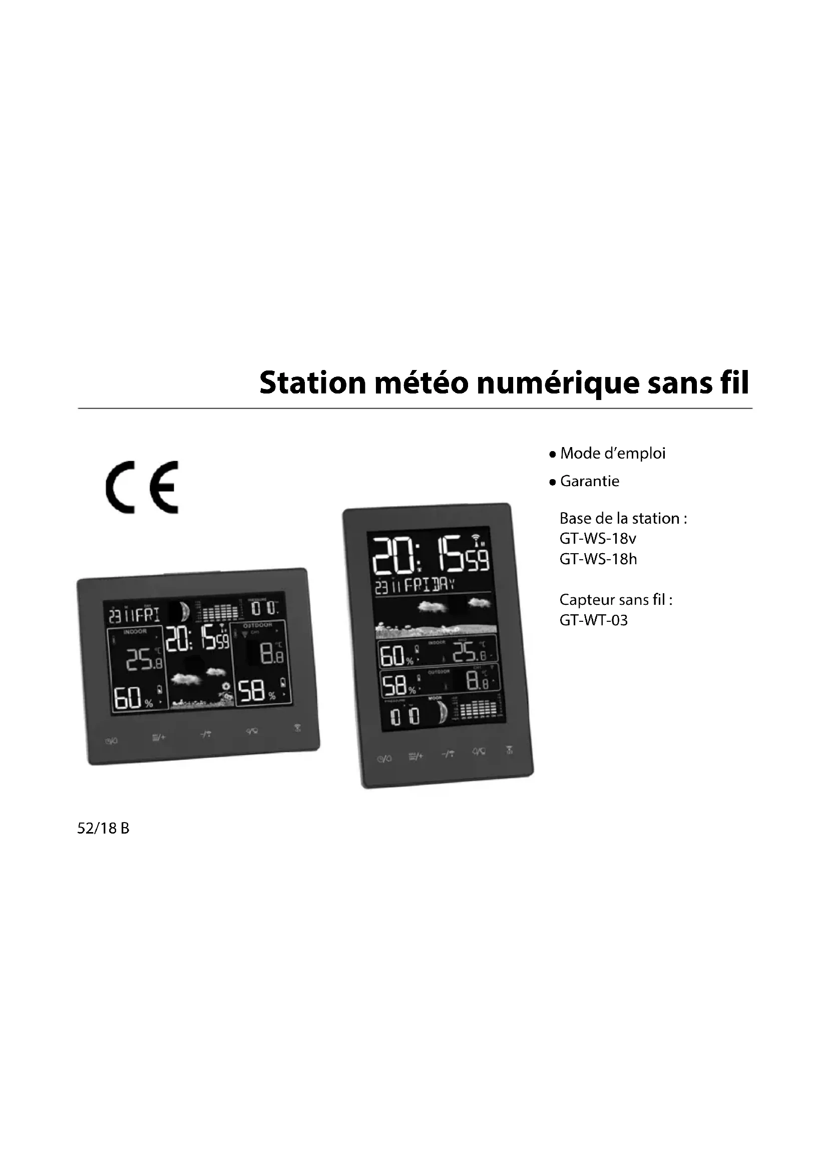 52/18 B Station météo numérique sans fil z Mode d’emploi z Garantie Base de la station : GT-WS-18v GT-WS-18h Capteur sans fil : GT-WT-03 FR Funkwetterstation.book Seite 1 Montag, 6. August 2018 8:01 08Sommaire