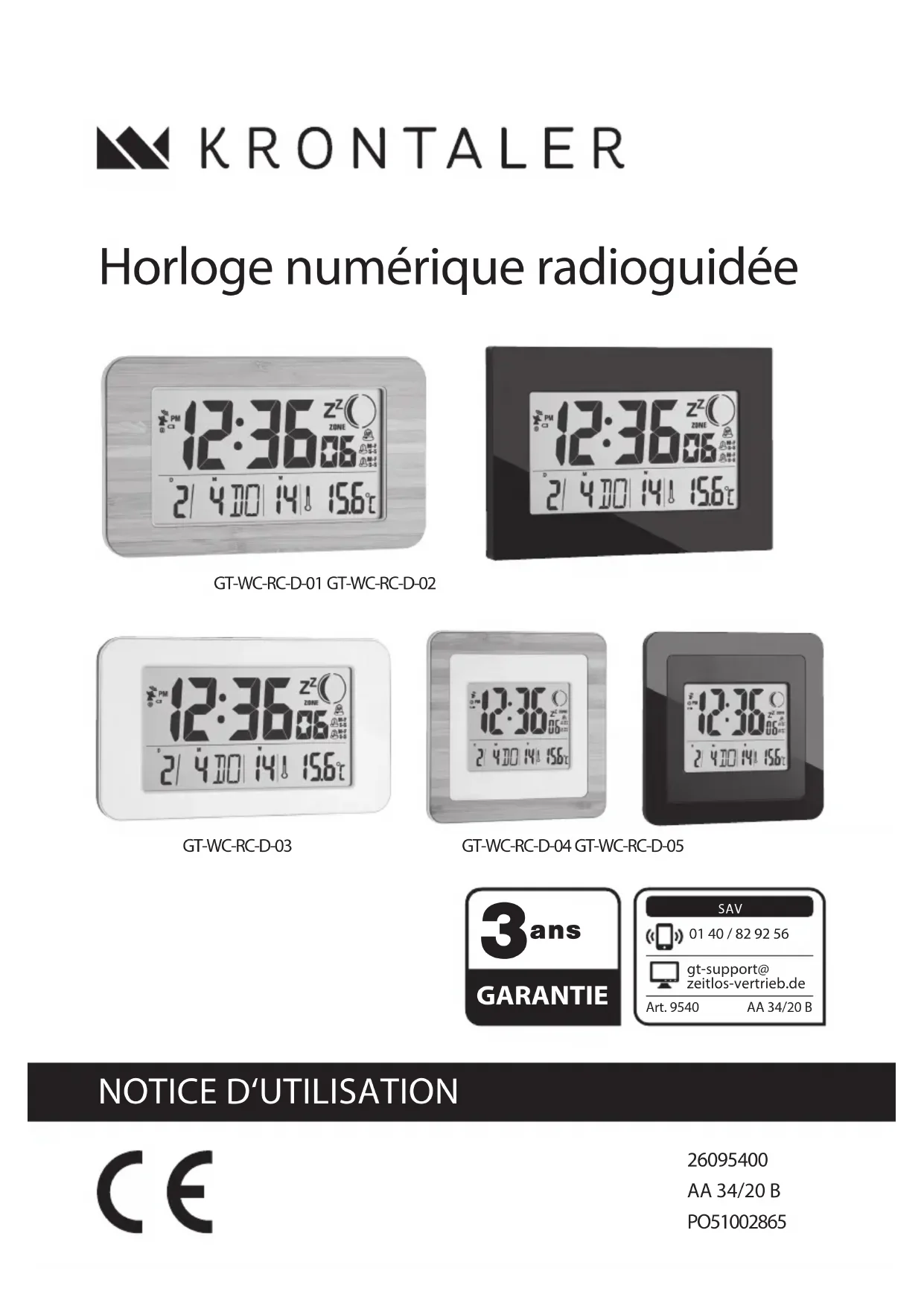 sec, à l’abri de la poussière et des dommages éventuels. Données techniques Alimentation : 2x LR03 / (AAA), 1,5 V , 2,2 mA Fréquence : 433 MHz Puissance de transmission max. : + 10 dBm Des modifications techniques et du design sont possibles car nos produits sont en permanence développés et améliorés. Cette notice d‘utilisation peut être téléchargée en format PDF sur notre site Internet www.gt-support.de. Déclaration de conformité RED Directive 2014/53/UE Cette horloge est conforme aux exi- gences et autres dispositions perti- nentes de la directive 2014/53/UE. Vous pouvez consulter le texte complet de la déclaration de conformité sur notre site web : www.gt-support.de. 13Fuseaux horaires City Code Pays Ville Zone 1 LON England London 0 2 DUB Ireland Dublin 0 3 WLG New Zealand Wellington 12 4 SYD Australia Sydney 10 5 TYO Japan Tokyo 9 6 SIN Singapore Singapore 8 7 HKG China Hong Kong 8 8 PED China Peking 8 9 BBK Thailand Bangkok 7 10 DBX UAE Dubai 4 11 MOW Russia Moscow 3 12 JRS Israel Jerusalem 2 13 IST Turkey Istanbul 2 14 CAI Egypt Cairo 2 15 CPT South Africa Cape Town 2 16 ATH Greece Athens 2 17 AMM Jordan Amman 2 18 PAR France Paris 1 19 FRA Germany Frankfurt 1 20 CPH Denmark Copenhagen 1 21 BCN Spain Barcelona 1 22 AMS Holland Amsterdam 1 23 ALA USA Alaska -9 24 LAX USA Los Angeles -8 25 MEX Mexico Mexico -6 26 CHI USA Chicago -6 27 YOW Canada Ottawa -5 28 WAS USA Washington DC -5 29 NYC USA New York -4 30 HAV Cuba Havanna -5 31 FAL ----------- Falkand Island -4 32 RIO Brazil Rio de Janeiro -3 14Recherche d’erreurs Dysfonctionnement Cause Solution L’horloge radiocomman- dée ne reçoit aucun signal. Les murs en béton, les logements en sous-sol, etc. affaiblissement le signal radio. Poser l’horloge radiocom- mandée la nuit sur un appui de fenêtre L’heure n’est pas correcte- ment affichée. L’horloge radiocomman- dée est mal configurée. Redémarrer l’horloge radiocommandée Les piles sont trop faibles. Remplacer les piles (voir le chapitre « Remplacement des piles »). Recyclage Élimination de l’emballage Éliminez l’emballage selon les sortes. Mettez le carton dans la collecte de vieux papier, les films dans la collecte de recyclage. Élimination de l’appareil Éliminez le produit conformément aux dispositions applicables dans votre pays. Il est interdit de jeter les appareils usagés dans les déchets ménagers. Conformément à la directive 2012/19/EU, l’appareil doit être éliminé de manière réglementaire à la fin de son cycle de vie. Les matières premières dont l’appareil est composé sont recyclées afin de protéger l’environnement. Déposez l’appareil usagé dans un point de collecte de déchets électriques ou dans un centre de recyclage. Les matériaux d’emballage doivent également être éliminés de matière conforme, triez-les avant de les déposer dans les conteneurs spécialement prévus à cet effet. Adressez-vous à votre entreprise locale de collecte des déchets ou à votre administration municipale pour obtenir de plus amples renseignements. Il est interdit de jeter les piles et batteries dans les ordures ménagères ! En tant que consommateur, la loi vous oblige à emmener toutes les piles et batteries, qu’elles contiennent des substances nocives ou non, dans un point de collecte de votre commune / de votre quartier ou chez le revendeur spécialisé, pour qu’elles puissent être traitées ou recyclées de manière écologique. *Caractérisés par : Pb = plomb 15Globaltronics Service Center Kleyling SAS / zeitlos design und vertriebs GmbH Transports Internationaux RN 415 68600 Algolsheim, France Fabriqué pour (Ce n’est pas l’adresse du SAV !) : PANA S.A.S. 8-10 avenue Ledru Rollin, 75012 Paris, France SAV 01 40 / 82 92 26 (Appel gratuit) gt-support@ zeitlos-vertrieb.de