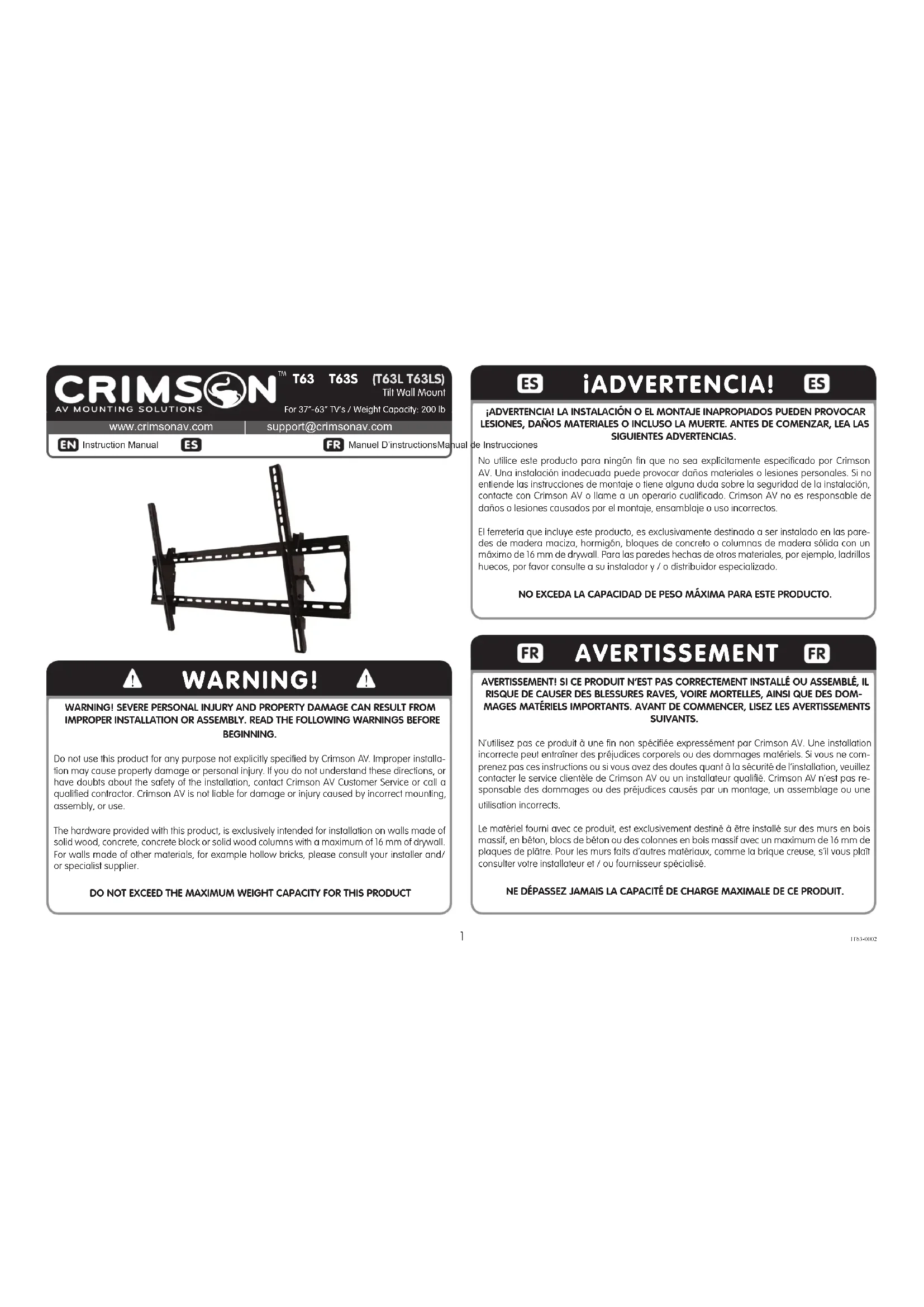 WARNING! SEVERE PERSONAL INJURY AND PROPERTY DAMAGE CAN RESULT FROM IMPROPER INSTALLATION OR ASSEMBLY. READ THE FOLLOWING WARNINGS BEFORE BEGINNING. Do not use this product for any purpose not explicitly specified by Crimson AV. Improper installa- tion may cause property damage or personal injury. If you do not understand these directions, or have doubts about the safety of the installation, contact Crimson AV Customer Service or call a qualified contractor. Crimson AV is not liable for damage or injury caused by incorrect mounting, assembly, or use.The hardware provided with this product, is exclusively intended for installation on walls made of solid wood, concrete, concrete block or solid wood columns with a maximum of 16 mm of drywall. For walls made of other materials, for example hollow bricks, please consult your installer and/or specialist supplier.DO NOT EXCEED THE MAXIMUM WEIGHT CAPACITY FOR THIS PRODUCT WARNING! AVERTISSEMENT! SI CE PRODUIT N’EST PAS CORRECTEMENT INSTALLÉ OU ASSEMBLÉ, IL RISQUE DE CAUSER DES BLESSURES RAVES, VOIRE MORTELLES, AINSI QUE DES DOM-MAGES MATÉRIELS IMPORTANTS. AVANT DE COMMENCER, LISEZ LES AVERTISSEMENTS SUIVANTS.N’utilisez pas ce produit à une fin non spécifiée expressément par Crimson AV. Une installation incorrecte peut entraîner des préjudices corporels ou des dommages matériels. Si vous ne com-prenez pas ces instructions ou si vous avez des doutes quant à la sécurité de l’installation, veuillez contacter le service clientèle de Crimson AV ou un installateur qualifié. Crimson AV n’est pas re- sponsable des dommages ou des préjudices causés par un montage, un assemblage ou une utilisation incorrects.Le matériel fourni avec ce produit, est exclusivement destiné à être installé sur des murs en bois massif, en béton, blocs de béton ou des colonnes en bois massif avec un maximum de 16 mm de plaques de plâtre. Pour les murs faits d’autres matériaux, comme la brique creuse, s’il vous plaît consulter votre installateur et / ou fournisseur spécialisé.NE DÉPASSEZ JAMAIS LA CAPACITÉ DE CHARGE MAXIMALE DE CE PRODUIT. AVERTISSEMENT2 IT63-0002 PACKAGE CONTENTS Contenido del paquete Contenu de l’emballage