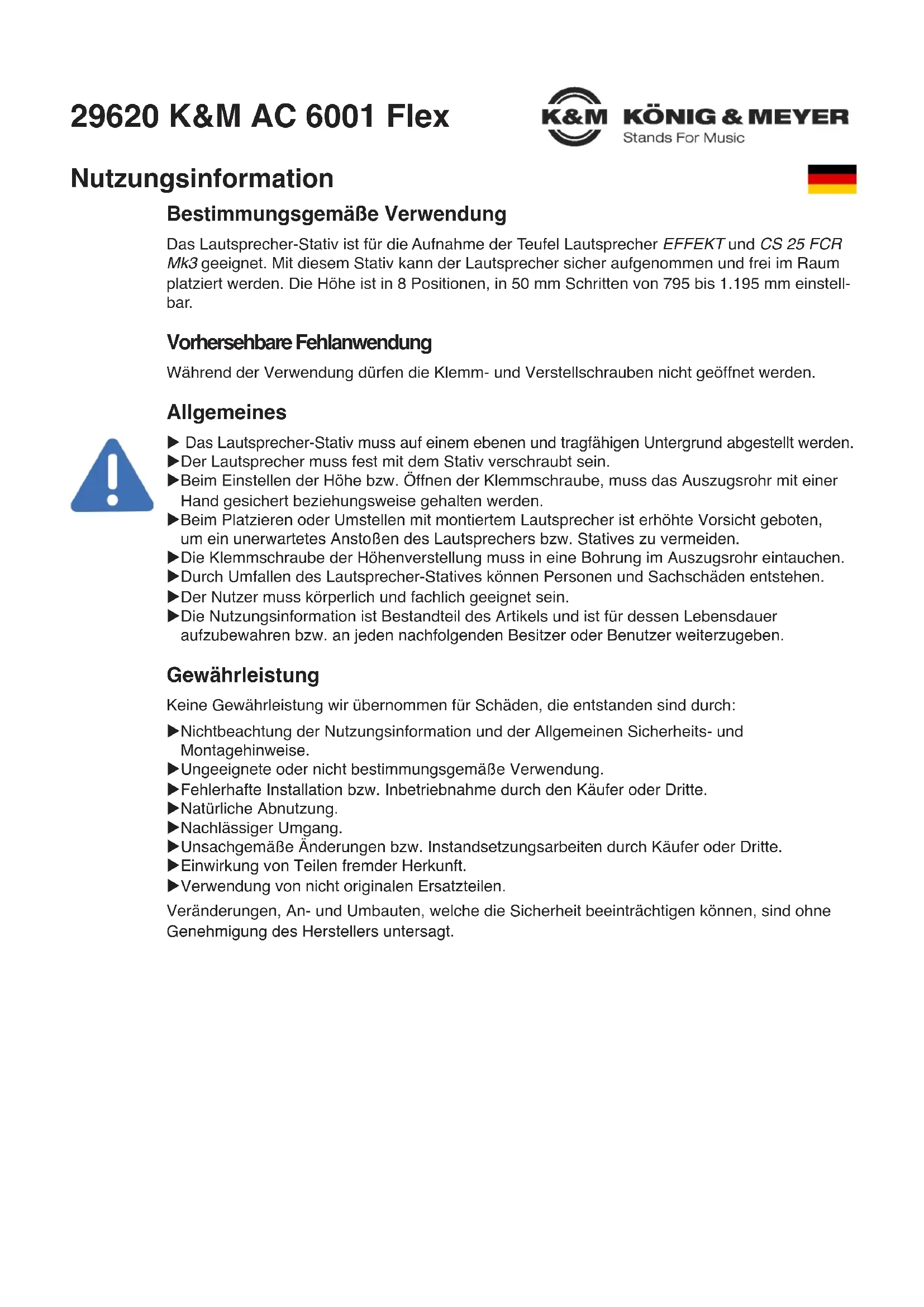 29620-000-55 / 29620-000-57 Rev.01 03-80-963-00 8/23 Guasti e loro risoluzione Guasto/causa Verifica/risoluzione La base non può essere inserita nel tubo di base ● Fare attenzione ai componenti di fissaggio e/o alle lung- ● hezze delle aste sul tubo di base. La piastra di raccordo non può essere inserita completamente nel tubo di base ● Fare attenzione ai componenti di fissaggio e/o alla lung- ● hezze delle aste sulla piastra di raccordo. Il cavalletto oscilla oppure è molto instabile ● Verificare il fondo e la superficie di appoggio. ● Verificare il raccordo a vite tra base e tubo di base, ● eventualmente serrare di nuovo. L’altoparlante non può essere fissato né bloccato saldamente ● Utilizzare il giusto foro di alloggiamento per il corrispon- ● dente altoparlante. ● Il bullone di bloccaggio deve inserirsi completamente ● nell’apertura. ● Riserrare i dadi di serraggio. L’altezza impostata non viene mantenuta, il tubo estraibile si ritrae ● Verificare e/o accertarsi che la vite di serraggio sia inse- ● rita in un foro del tubo estraibile.29620 K&M AC 6001 Flex Informations sur l'utilisation Utilisation conforme à la destination Le trépied de haut-parleur est conçu pour accueillir les haut-parleurs Teufel EFFEKT et CS 25 FCR Mk3. Ce trépied permet de prendre le haut-parleur en toute sécurité et de le pla-cer libre- ment dans la pièce. La hauteur est réglable en 8 positions, par pas de 50 mm, de 795 à 1195 mm. Mauvaise utilisation prévisible Pendant l'utilisation, les vis de serrage et de réglage ne doivent pas être ouvertes. Généralités u Le trépied de haut-parleur doit être posé sur une surface plane et solide. u L'haut-parleur doit être solidement vissé au trépied. u Lors du réglage de la hauteur ou de l'ouverture de la vis de serrage, le tube d'extension doit u être sécurisé ou maintenu d'une main. u Lors du placement ou du déplacement, ainsi que lors du réglage de la hauteur avec le haut- u parleur monté, il convient de faire preuve d'une grande prudence afin d'éviter de heurter le u haut-parleur ou le trépied de manière inattendue. u La vis de serrage pour le réglage de la hauteur doit s'enfoncer dans un trou du tube d'extension. u Le renversement du pied de haut-parleur peut entraîner des dommages corporels et matériels. u L'utilisateur doit être apte sur le plan physique et professionnel. u Les informations d'utilisation font partie intégrante de l'article et doivent être conservées u pendant toute sa durée de vie ou transmises à tout autre propriétaire ou utilisateur ultérieur. Garantie Aucune garantie n'est accordée pour les dommages causés par: u Non-respect des informations d'utilisation et des consignes générales de sécurité et de montage. u Utilisation inappropriée ou non conforme à l'usage prévu. u Installation resp. mise en service défectueuse par l'acheteur ou un tiers. u Usure naturelle. u Manipulation négligente. u Des modifications resp. des travaux de réparation non conformes effectués par l'acheteur ou u par des tiers. u Influence de pièces d'origine étrangère. u Utilisation de pièces de rechange non originales. Les modifications, ajouts et transformations susceptibles de nuire à la sécurité sont in-terdits sans l'autorisation préalable du fabricant.Montage 1.) Déballer l'article et vérifier qu'il n'e soit pas endommagé et que la livraison soit complète Données techniques Matériau Socle, plaque de liaison, tube de base, tube d'extension : acier, revêtement par poudre noir ou blanc Vis à tête hexagonale, boulon de serrage, vis de serrage, rondelle : acier galvanisé Écrou de serrage : plastique, acier galvanisé Coques de guidage : plastique, noir Revêtement : caoutchouc Capacité de charge Teufel EFFEKT et CS 25 FCR Mk3, max. 1,2 kg Dimensions (L) 220 x (P) 240 x (H) 795 - 1195 mm Réglage Hauteur du sol au bord supérieur du trépied, 795 - 1195 mm, en 8 pas de 50 mm Emballage (L) 850 x (P) 245 x (H) 80 mm Poids Unité 4,6 kg, paire 9,2 kg 1 Sachet d'accessoires : 2x boulons de serrage 4x vis à six pans M6 x 20 mm 2x écrous de serrage 2x plaque de liaison 1x rondelle ø 6,4/17,8 x 1,6 mm 1x clé SW10/13 2 2x socle 3 2x tube de base et tube 3 d'extension 2.) Monter le trépied avec l'haut-parleur filaire 1 Glisser le câble par le haut à travers tube d'extension, le tube de base et le socle. 2 Pousser la plaque de connexion dans l'encoche prévue à cet effet. La plaque de connexion doit être à fleur du tube de base. REMARQUE : Aussi bien la plaque de connexion que le tube de base sont pro- tégés contre un montage incorrect par des longueurs d'entretoise différentes. Veillez à prendre en compte la longueur des entretoises lors du montage. Les composants s'assemblent facilement lorsqu'ils sont dans la bonne position. 3 Fixer le socle au tube de base et le visser à la main avec les deux vis à tête hexagonale. Le couple de serrage maximal ne doit pas dépasser les 8 Nm.3.) Monter l'haut-parleur sur le trépied Entretien, nettoyage et réparation u Entretien : contrôle régulier du bon serrage des raccords vissés. u Nettoyage : pour nettoyer le trépied pour haut-parleurs, utiliser un chiffon légèrement humidi- u fié. Ne pas utiliser de produits de nettoyage contenant du chlore ou abrasifs. Ceux-ci peuvent u causer des dommages à la surface et à la peinture. u Réparer les dommages : réparer immédiatement les dommages survenus et ne plus utiliser u les trépieds de haut-parleurs. Les travaux de maintenance ne peuvent être effectués que si vous u possédez les connaissances nécessaires à cet effet. En cas de pièces manquantes, contactez u le fabricant via www.k-m.de. Introduisez le boulon de serrage par l'avant dans le trou de réception du tube d'extension et vissezle sans le serrer avec l'écrou de serrage. Utilisez l'ouverture en forme de trou de serrure du haut-parleur pour l'accrocher sur le boulon de serrage. Veillez à ce que le