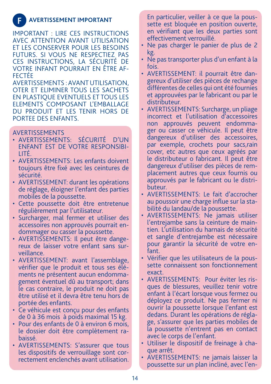 AVERTISSEMENTS: Ne laissez pas votre enfant jouer avec ce produit. Pour éviter tout risque d’étranglement, ne pas donner à l’enfant et ne pas placer près de lui des objets munis de cordes. AVERTISSEMENTS: ne pas utiliser la poussette dans les escaliers ou sur un escalator afin de ne pas perdre soudainement le contrôle. Faire ATTENTION lors de la montée et de la descente d’une marche ou d’un trottoir. Si vous laissez la poussette au soleil trop longtemps, attendez qu’elle refroidisse avant d’y mettre l’enfant. L’exposition prolongée au soleil peut entraîner des changements de couleur au niveau des matériaux et des tissus. Ne pas utiliser le produit si certaines parties sont abîmées, arrachées ou absentes. AVERTISSEMENTS: Vérifier que les dispositifs de fixation de la nacelle ou du siège soient correctement enclenchés avant usage AVERTISSEMENTS: quand elle n’est pas utilisée, la poussette doit être tenue hors de portée des enfants. AVERTISSEMENTS: Ne pas utiliser ce produit en faisant du jogging ou des promenades en rollers. Éviter le contact de la poussette avec l’eau saline pour prévenir la formation de rouille. Ne pas utiliser la poussette à la plage. AVERTISSEMENTS: ce produit doit être utilisé exclusivement par un adulte.