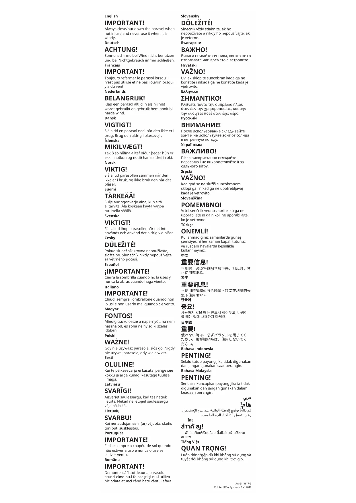 | Sécurité | Veiller à bien fixer le parasol au sol pour éviter qu'il ne s'envole par temps venteux. |