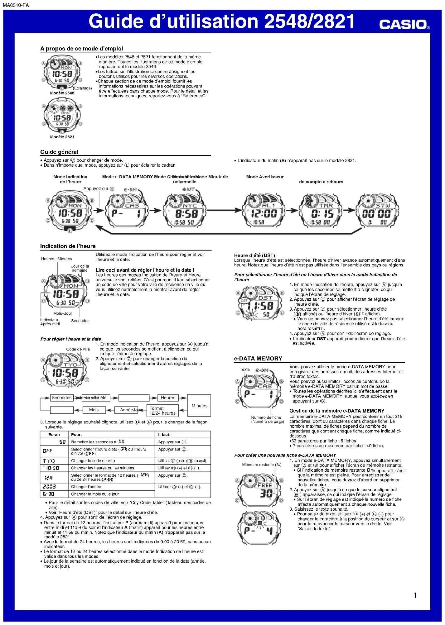 - Si vous laissez la montre deux ou trois minutes dans le mode e-DATA MEMORY ou Avertisseur sans effectuer aucune opération, elle revient automatiquement au mode Indication de l’heure.