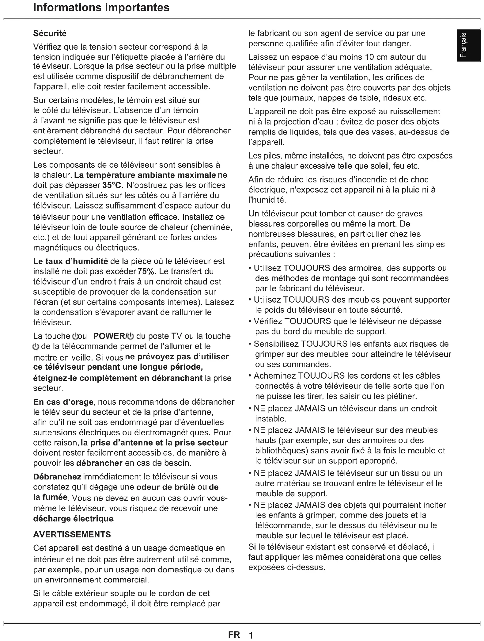 AVERTISSEMENTS Cet appareil est destiné à un usage domestique en intérieur et ne doit pas être autrement utilisé comme, par exemple, pour un usage non domestique ou dans un environnement commercial. Si le câble extérieur souple ou le cordon de cet appareil est endommagé, il doit être remplacé par le fabricant ou son agent de service ou par une personne qualiée an d’éviter tout danger. Laissez un espace d’au moins 10 cm autour du téléviseur pour assurer une ventilation adéquate. Pour ne pas gêner la ventilation, les orices de ventilation ne doivent pas être couverts par des objets tels que journaux, nappes de table, rideaux etc. L’appareil ne doit pas être exposé au ruissellement ni à la projection d’eau ; évitez de poser des objets remplis de liquides, tels que des vases, au-dessus de l’appareil. Les piles, même installées, ne doivent pas être exposées à une chaleur excessive telle que soleil, feu etc. An de réduire les risques d'incendie et de choc électrique, n'exposez cet appareil ni à la pluie ni à l'humidité. Un téléviseur peut tomber et causer de graves blessures corporelles ou même la mort. De nombreuses blessures, en particulier chez les enfants, peuvent être évitées en prenant les simples précautions suivantes :