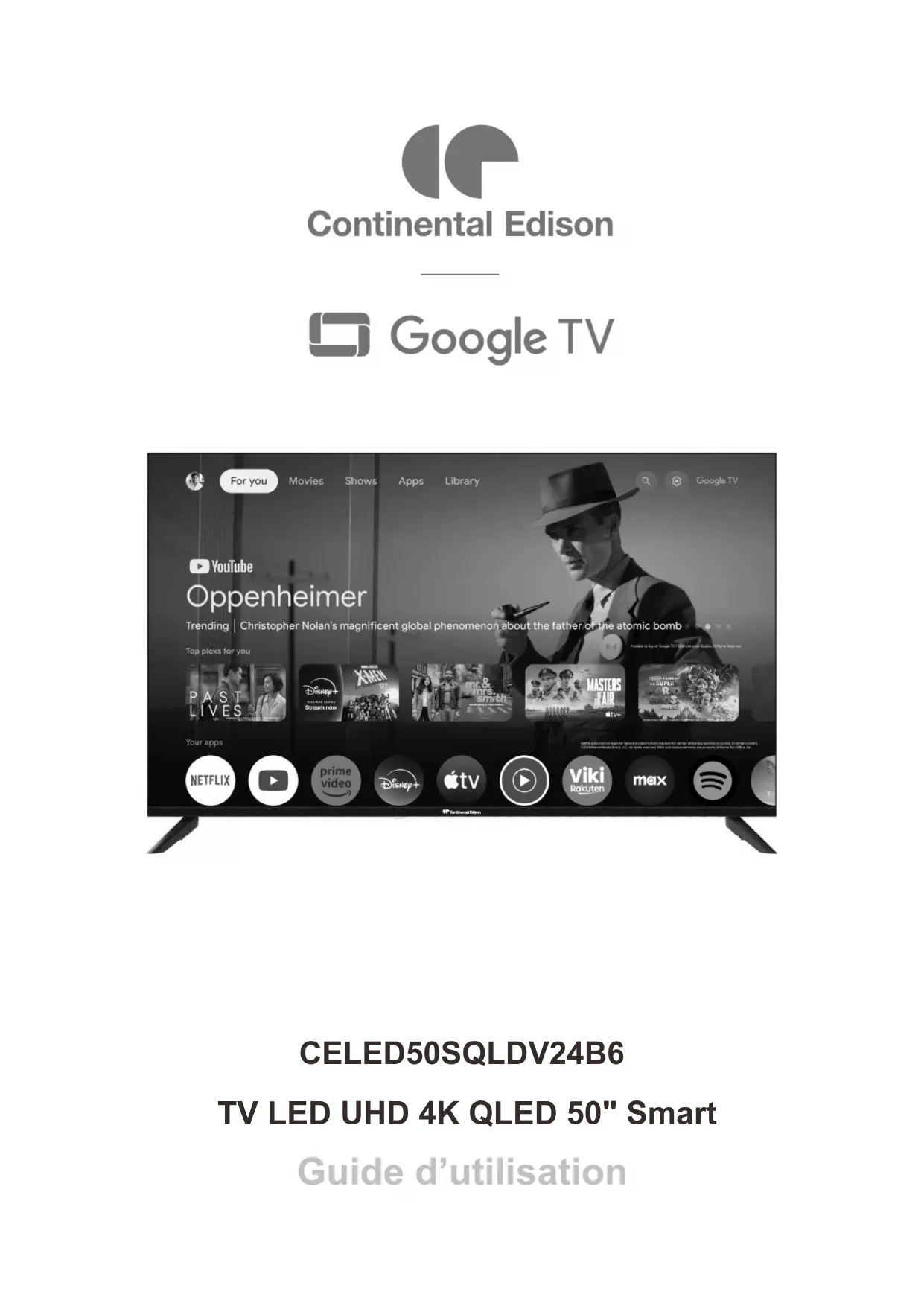 applications applications353637 «Disponibilité des pièces de rechange : Les pièces de rechange indispensables à l’utilisation de votre téléviseur [télécommande, source d’alimentation électrique, carte principale, connecteurs externes] sont disponibles pendant une période de 10 ans après la date de votre achat (indiquée sur la facture). »38 Importé par CONTINENTAL EDISON – 120 - 126 Quai de Bacalan – 33000 Bordeaux – France – marketing@continentaledison.frGoogle TV est le nom du logiciel de cet appareil et une marque commerciale de Google LLC. Google, YouTube, Google Cast intégré et YouTube Music sont des marques commerciales de Google LLC.