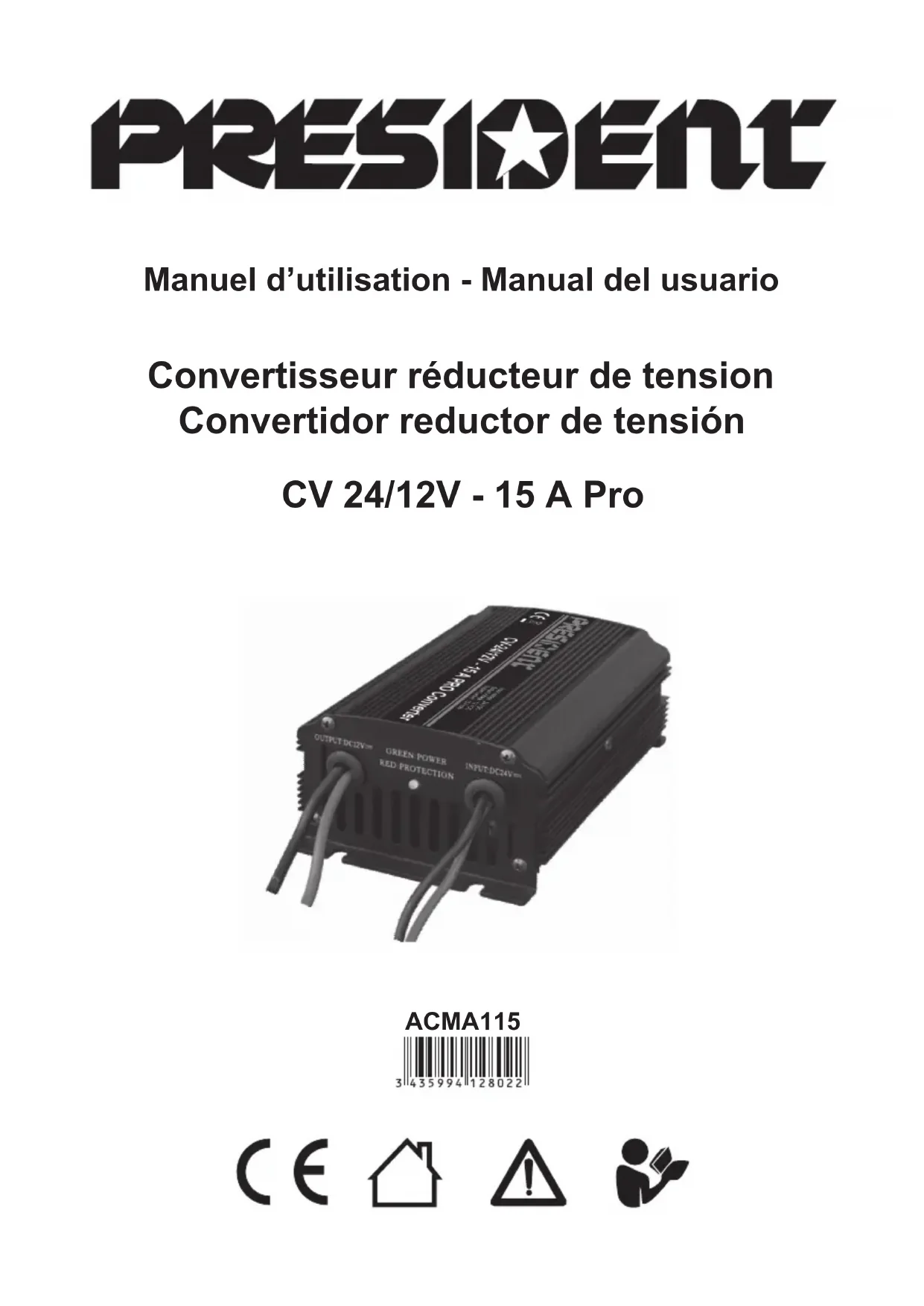 Convertisseur réducteur de tension Convertidor reductor de tensión ACMA115 Manuel d’utilisation - Manual del usuario CV 24/12V - 15 A ProManuel d’utilisation ............................................. 3 Manual del usuario .............................................. 83 INTRODUCTION Merci d’avoir choisi un convertisseur PRESIDENT. Ce produit a été développé selon tous les critères qualitatifs de la marque PRESIDENT, pour répondre aux attentes les plus exigeantes de nos clients, dans un souci de robustesse et de qua- lité. Avant d’utiliser le produit, veuillez lire attentivement ce manuel et conservez-le précieusement. Le CV 24/12 - 15 A Pro est un convertisseur réducteur de tension qui convertit une source de tension continue de 24 V, généralement fournie par un ou plusieurs ac- cumulateurs, en une source de tension continue de 12 V appropriée pour alimenter divers dispositifs présents dans vos véhicules. Ce convertisseur PRESIDENT est fabriqué avec des composants et circuits avan- cés qui garantissent une qualité supérieure, un poids réduit et une petite taille. Il est robuste et équipé de circuits de protection contre les surcharges de sortie, la surchauffe, les court-circuits d’entrée, les court-circuits de sortie et les surtensions d’entrée. Néanmoins, pour assurer le bon fonctionnement et prévenir les dom- mages au convertisseur de tension, aux appareils connectés et aux personnes, il est obligatoire d’effectuer une installation correcte.