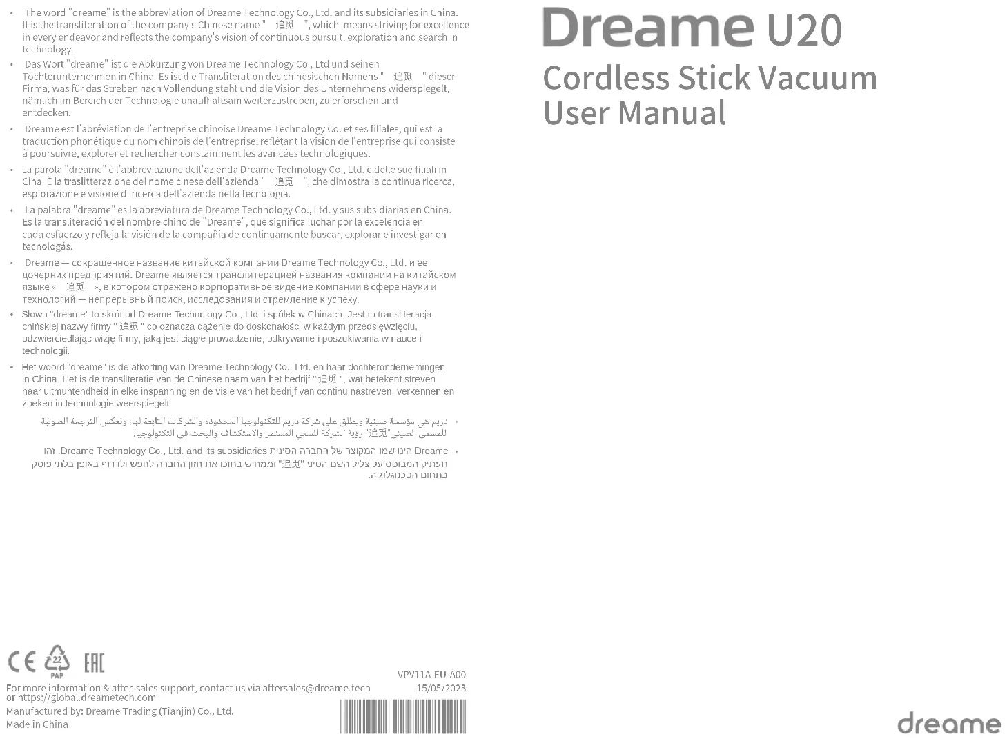 Retrouvez gratuitement la notice de l'appareil U20 DREAME au format PDF.
