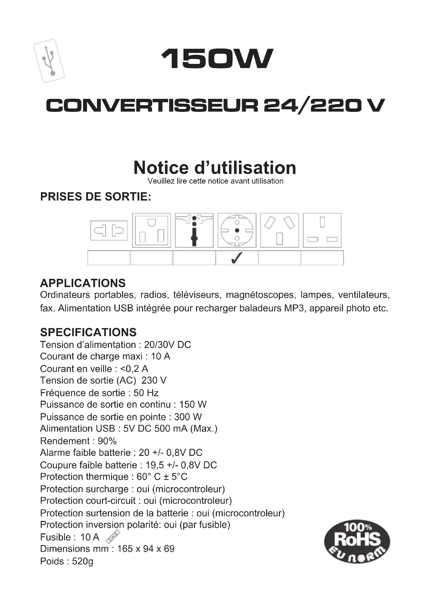 APPLICATIONS Ordinateurs portables, radios, téléviseurs, magnétoscopes, lampes, ventilateurs, fax. Alimentation USB intégrée pour recharger baladeurs MP3, appareil photo etc. SPECIFICATIONS Tension d’alimentation : 20/30V DC Courant de charge maxi : 10 A Courant en veille : <0,2 A Tension de sortie (AC) 230 V Fréquence de sortie : 50 Hz Puissance de sortie en continu : 150 W Puissance de sortie en pointe : 300 W Alimentation USB : 5V DC 500 mA (Max.) Rendement : 90% Alarme faible batterie : 20 +/- 0,8V DC Coupure faible batterie : 19,5 +/- 0,8V DC Protection thermique : 60° C ± 5°C Protection surcharge : oui (microcontroleur) Protection court-circuit : oui (microcontroleur) Protection surtension de la batterie : oui (microcontroleur) Protection inversion polarité: oui (par fusible) Fusible : 10 A Dimensions mm : 165 x 94 x 69 Poids : 520g Notice d’utilisation Veuillez lire cette notice avant utilisation PRISES DE SORTIE: 150W CONVERTISSEUR 24/220 VDépannage Si le convertisseur ne semble pas fonctionner correctement, il peut y avoir plusieurs raisons :