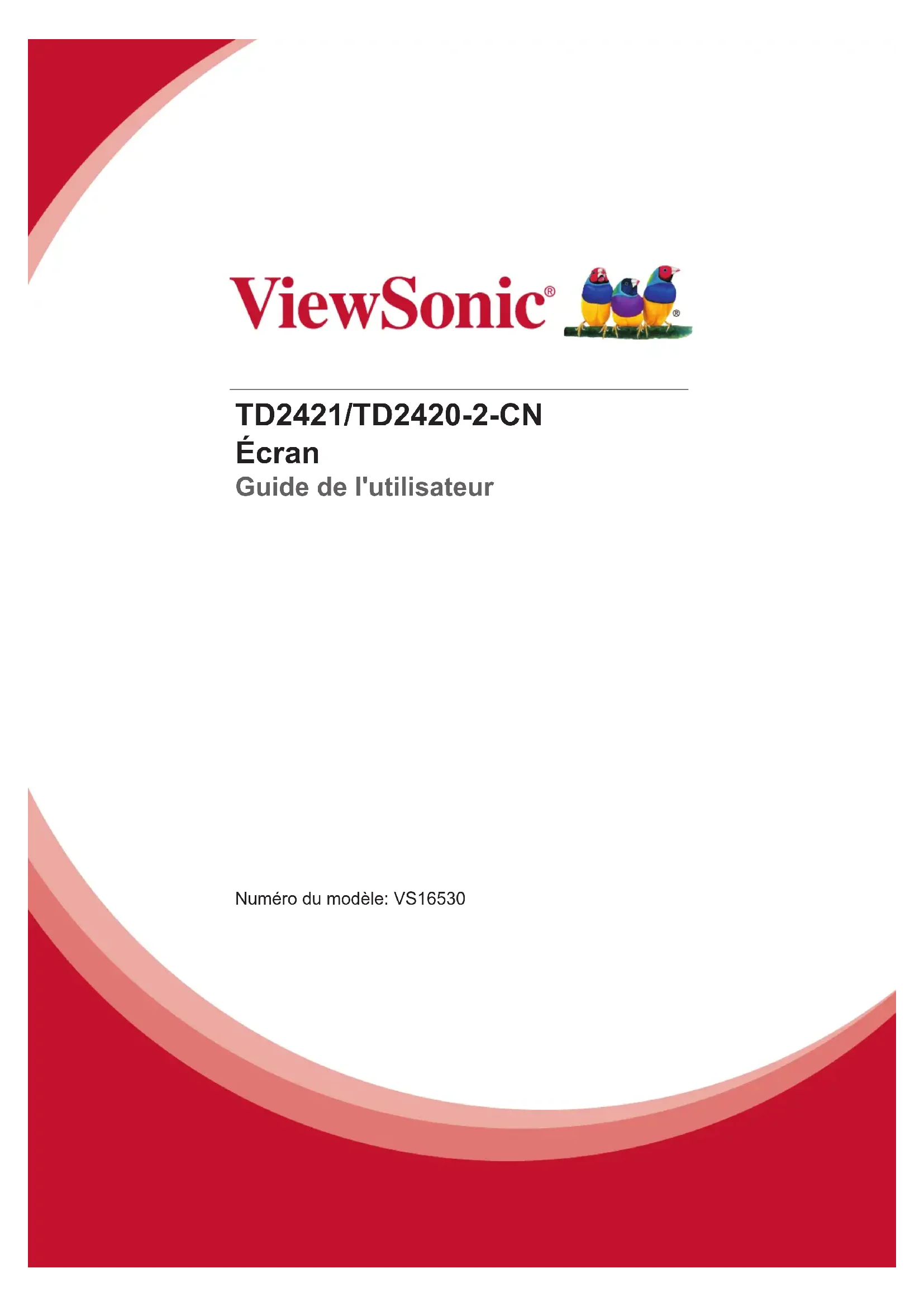TD2421/TD2420-2-CN Écran Guide de l'utilisateur Numéro du modèle: VS16530Merci d’avoir choisi ViewSonic Avec plus de 30 années d’expérience en tant que fournisseur mondial majeur en solutions visuelles, ViewSonic se consacre à dépasser les at- tentes du monde pour les évolutions technologiques, l’innovation et la simplicité. Chez ViewSonic, nous croyons que nos produits ont le poten- tiel d’avoir un impact positif sur le monde, et sommes confiants que le produit ViewSonic que vous avez choisi vous sera utile. Encore une fois, merci d’avoir choisi ViewSonic !i Informations de conformité REMARQUE: Cette section porte sur les exigences de branchement et les déclarations de conformité. Les applications spécifiques devront se reporter aux étiquettes signalétiques et aux symboles figurant sur l’appareil. Declaration de conformite FCC Cet appareil est conforme à l’article 15 des Règlements FCC. Son fonctionnement est sujet aux deux conditions suivantes: (1) Cet appareil ne doit pas provoquer d’interférences néfastes, et (2) cet appareil doit accepter toutes les interférences reçues, y compris celles pouvant provoquer un fonctionnement indésirable. Cet équipement a été testé et déclaré conforme aux limites d'un dispositif numérique de la classe B, conformément à la partie 15 des règles de la FCC. Ces limites sont conçues pour fournir une protection raisonnable contre les interférences nocives pour une installation résidentielle. Cet équipement produit, utilise et peut émettre une énergie à fréquence radio et s'il n'est pas installé et utilisé conformément aux instructions, peut provoquer des interférences nocives aux communications radio. Cependant, il n'y a aucune garantie que les interférences ne se produiront pas dans une installation particulière. Si cet équipement provoque des interférences nocives à la réception radio ou TV qu'il est possible de déterminer en mettant l'équipement en marche ou à l'arrêt, l'utilisateur est encouragé à essayer de rectifier les interférences en adoptant au moins l'une des mesures suivantes :