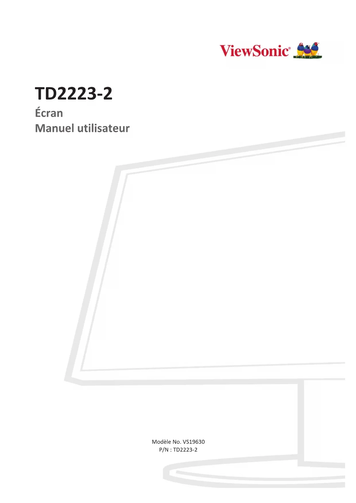 TD2223-2 Écran Manuel utilisateur Modèle No. VS19630 P/N : TD2223-22 Merci d’avoir choisi ViewSonic® En tant que leader mondial de solutions visuelles, ViewSonic® se consacre à dépasser les attentes du monde en matière d’évolution technologique, d’innovation et de simplicité. Chez ViewSonic®, nous pensons que nos produits peuvent avoir un impact positif dans le monde et nous sommes convaincus que le produit ViewSonic® que vous avez choisi vous servira correctement. Une fois de plus, merci d’avoir choisi ViewSonic® !3 Précauons relaves à la sécurité