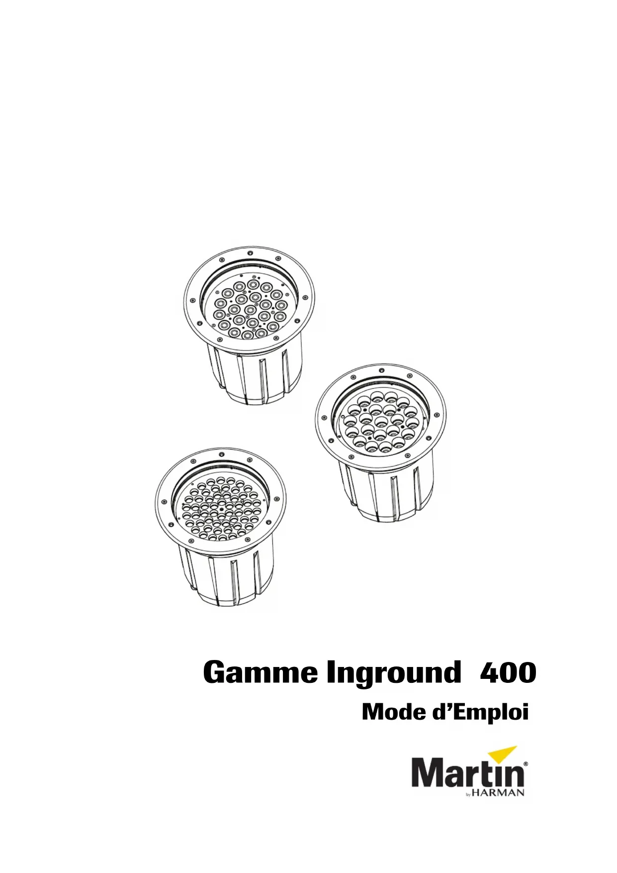 Ðò32Ðò34 Anneau de fermeture Anneau encastré Avec anneau biseauté Contenu sujet à modification sans préavis. HARMAN Professional ApS décline toute responsabilité en cas de blessure, dommage, direct ou indirect, conséquent ou économique ou de toute autre type occasionné par l’impossibilité d’utiliser ou l’utilisation ou la non fiabilité des informations contenues dans ce manuel. ©2004-2017 HARMAN Professional Denmark ApS. Tous droits réservés. Martin® est une marque déposée de HARMAN Professional Denmark ApS enregistrée aux Etats Unis et d’autres états. Fonctionnalités, spécifications et visuels sont sujets à modification sans préavis. HARMAN Professional Denmark ApS - Olof Palmes Allé 18 - 8200 Aarhus N - Denmark www.martin.com Inground 400 Series, mode d’emploi : P/N 5081891 Rev. EPrécautions d’emploi 3 Précautions d’emploi Les symboles suivants permettent d’identifier les informations de sécurité importantes sur le produit et dans ce manuel: Ce produit est destiné à un usage professionel uniquement et doit être installé par un technicien qualifié. Il n’est pas destiné à un usage domestique. Ce produit présente des risques importants de blessures sévères voire mortelles par brûlure ou incendie, électrisation et chute de hauteur. Il produit un faisceau de lumière concentré qui peut créer un risque d’incendie ou de lésions oculaires si les précautions d’emploi dans ce manuel ne sont pas respectées. Groupe de risque 1 selon EN 62471 à condition que le filtre diffuseur fourni avec l’appareil ne soit pas retiré. L’installation, l’utilisation et l’entretien des produits Martin® doivent être réalisés comme indiqué dans ce manuel sous peine de créer un risque de sécurité ou des dommages non couverts par la garantie. Suivez les précautions d’emploi listées ci-dessous et respectez toutes les mises en garde dans ce manuel et sur l’appareil lui-même. Avant d’utiliser ce manuel, vérifiez que vous disposez bien de la dernière mise à jour. Vous pouvez télécharger toutes les documentations relatives depuis la rubrique Tech Docs / Product Support sur www.martin.com. Pour toute question ou en cas de doute sur l’installation, l’utilisation ou l’entretien de ce produit, contactez votre revendeur Martin® ou contactez la hotline 24/7 de Martin® au +45 8740 0000, ou pour les USA au 1-888-tech-180. Respectez toutes les règlementations, tous les codes et décrets locaux lors de l’installation, de l’utilisation et de l’entretien. Référez toute opération non décrite ici à un technicien qualifié.
