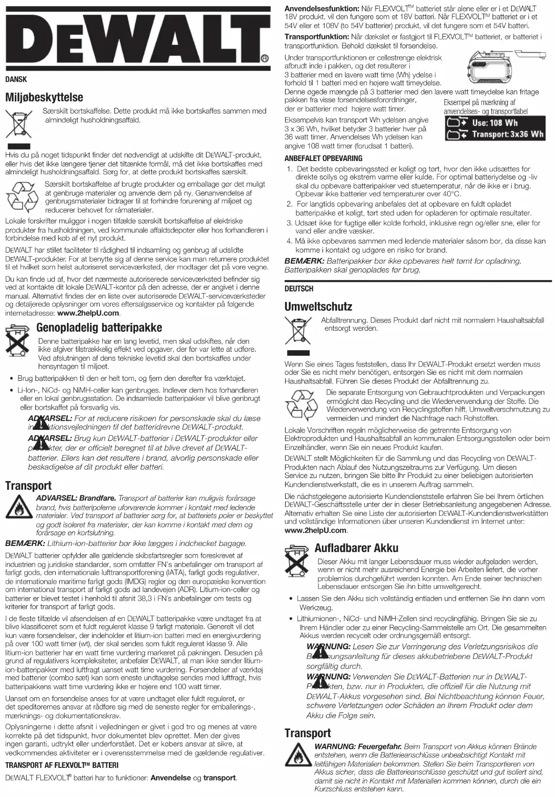 contacto y suponer un riesgo de incendio. NOTA: Los paquetes de pilas no deberán guardarse completamente descargados. El paquete de pilas deberá recargarse antes deutilizarse. FRANÇAIS Protection de l’environnement Collecte sélective. Ne pas jeter ce produit avec les ordures ménagères. En fin de durée de vie ou d’utilité de votre produit DeWALT, ne pas le jeter avec les ordures ménagères, mais dans les conteneurs de collecte sélective. La collecte sélective des produits et emballages usagés permet de recycler et réutiliser leurs matériaux. La réutilisation de matériaux recyclés aide à protéger l’environnement contre la pollution et à réduire la demande en matière première. Selon les réglementations locales, il peut être offert: service de collecte sélective individuel des produits électriques, ou déchetterie municipale ou collecte sur les lieux d’achat des produits neufs. DeWALT dispose d’installations pour la collecte et le recyclage des produits DeWALT en fin de vie. Pour profiter de ce service, veuillez rapporter votre produit auprès d’un centre de réparation agréé qui le recyclera en notre nom. Pour connaître l’adresse d’un centre de réparation agréé près de chez vous, veuillez contacter votre distributeur DeWALT local à l’adresse indiquée dans cette notice d’instructions, ou consulter la liste des centres de réparation agréés DeWALT, l’éventail de notre SAV et tout renseignement complémentaire sur Internet à l’adresse: www.2helpU.com. Batterie rechargeable Recharger cette batterie longue durée lorsqu’elle ne produira plus assez de puissance pour effectuer un travail qu’elle faisait facilement auparavant. En fin de vie utile, mettre la batterie au rebut conformément à la réglementation en matière d’environnement: