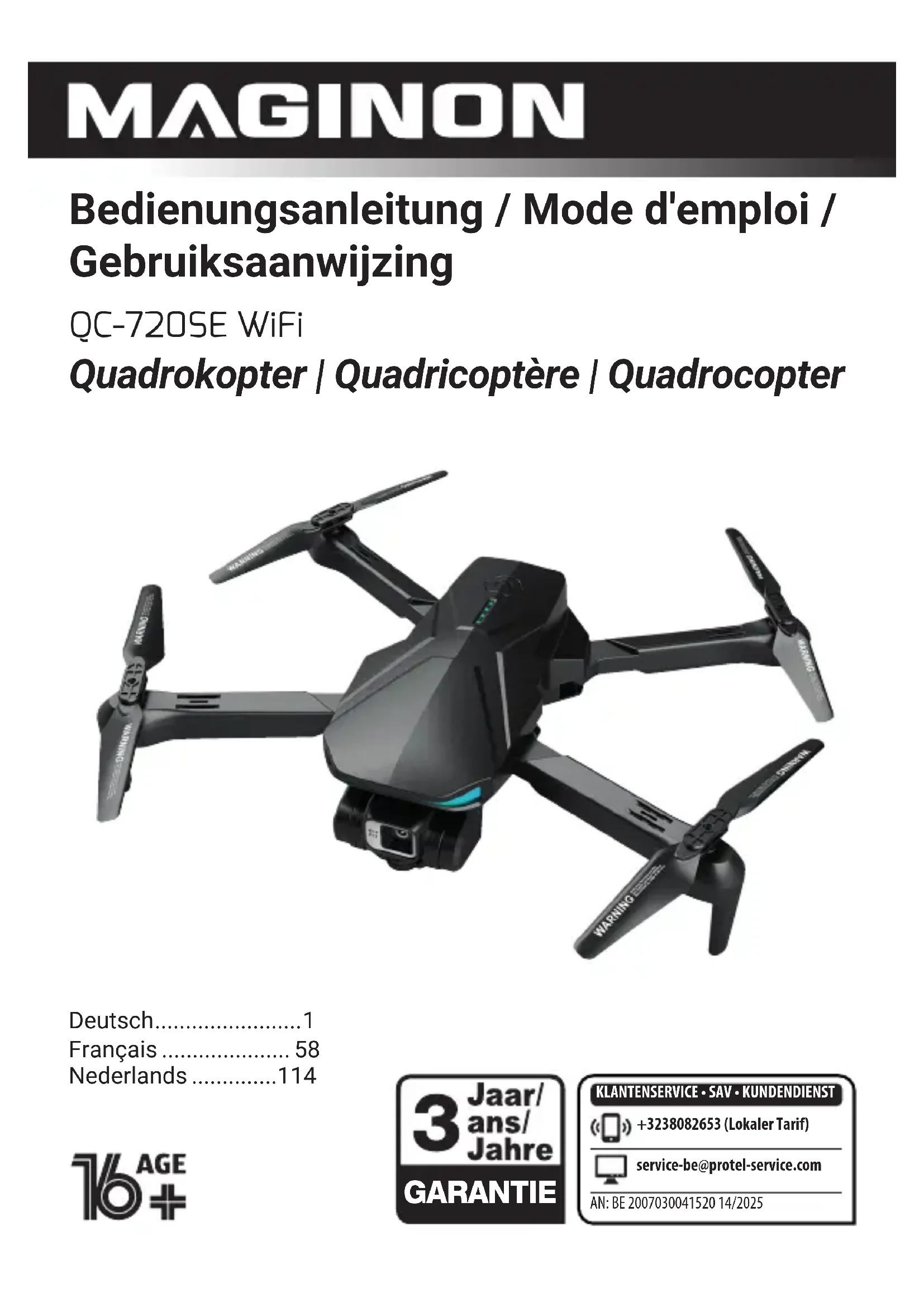 Préambule Chère cliente, cher client, Félicitations pour l’achat d’un produit de haute qualité MAGINON. Vous avez choisi un quadricoptère moderne doté d’excellentes fonctionnalités techniques et d’accessoires adaptés, particulièrement facile d’utilisation. Le quadricoptère est garanti pendant trois ans. Dans le cas où votre quadricoptère serait défectueux, munissez-vous de la carte de garantie jointe et de votre ticket de caisse. Conservez-les soigneusement avec le quadricoptère. Vous trouverez des informations sur l’achat de pièces de rechange et d’accessoires additionnels sur le site https://shop.maginon.com/de Impressum Éditeur: supra Foto-Elektronik-Vertriebs-GmbH Denisstr. 28 a 67663 Kaiserslautern Allemagne Généralités Ce quadricoptère fait partie de la classe C0 de la catégorie ouverte des véhicules aériens sans pilote. Conformément à la directive européenne (UE) 2019/847, les exploitants de quadricoptères équipés d'une caméra intégrée sont tenus de s'enregistrer en ligne. Veuillez consulter la réglementation en vigueur. L'enregistrement peut être payant dans votre pays. Veuillez vous informer au préalable. Enregistrement: Veuillez consulter la réglementation en vigueur dans votre pays pour l'immatriculation et l'utilisation des quadricoptères. Le numéro d'opérateur de quadrocoptère (e-ID) obtenu après l'enregistrement doit être apposé de manière bien visible sur tous les quadrocoptères de l'opérateur, z. par exemple au moyen d'un autocollant pour quadrocoptères UE. Sur ce modèle, vous pouvez fixer la plaquette de quadrocoptère UE sur le dessus du quadrocoptère. Selon l’utilisation du quadricoptère, il peut être nécessaire, le cas échéant, d’être en possession d’un permis de quadrocoptère. Lors de l’utilisation du quadricoptère, vous devez toujours avoir avec vous tous les documents requis.Généralités Généralités