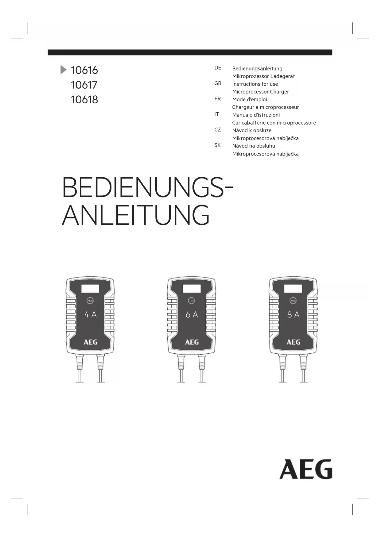 Batteries plomb-acide sans entretien (MF) L‘appareil peut être branché avec des pinces direc- tement à la batterie. Ce chargeur n‘est pas prévu pour recharger d‘autres types de batteries que ceux mentionnés ci-dessus. Cet appareil n‘est pas conçu pour être utilisé par des enfants ou des personnes à capacités mentales réduites ou manquant d‘expérience et/ou de connaissances. Les enfants devraient être surveillés pour s‘assurer qu‘ils ne jouent pas avec l‘appareil. L‘appareil n‘est pas prévu pour une utilisation commerciale. Cet appareil n’est pas conçu pour être utilisé par des enfants ou des personnes à capacités mentales réduites ou manquant d’expérience et/ou de connaissances. Les enfants devraient être surveillés pour s’assurer qu’ils ne jouent pas avec l’appareil. Familiarisez-vous avant la première mise en service avec toutes les fonctions de l‘appareil et informez- vous sur l‘utilisation correcte de l‘appareil. Lisez pour cela attentivement la notice d‘utilisation suivante. Conservez-la bien. Fournissez également tous les documents lorsque vous transmettez l‘appareil à un tiers.www.aeg-automotive.com