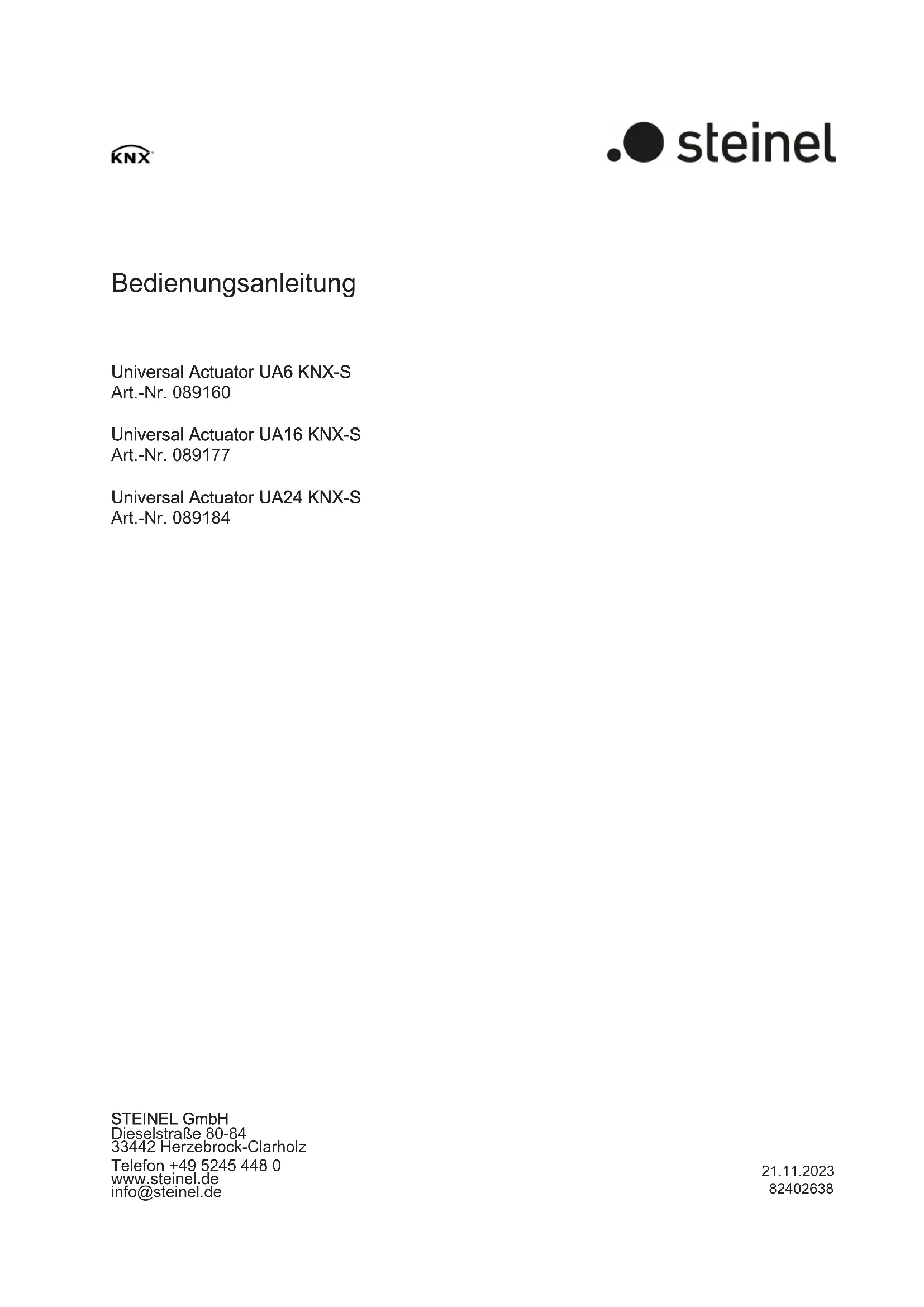 - mm² à fils minces avec embout 0,5 ,5mm² Conditions ambiantes Température ambiante -5 +45°C Température de stockage/transport -25 +70°C Universal Actuator 14 / 15 82402638 21.11.2023Couple de serrage bornes à vis max.0,8Nm 7 Garantie Nous nous réservons toute modification formelle sur le produit dans la mesure où elle contribue au progrès technique. Nous accordons les garanties prévues par la loi. STEINEL GmbH Dieselstraße 80-84 33442 Herzebrock-Clarholz Telefon +49 5245 448 0 www.steinel.de info@steinel.de Universal Actuator 15 / 15 82402638 21.11.2023Istruzioni per l’uso Universal Actuator UA6 KNX-S N. art. 089160 Universal Actuator UA16 KNX-S N. art. 089177 Universal Actuator UA24 KNX-S N. art. 089184 p. 2