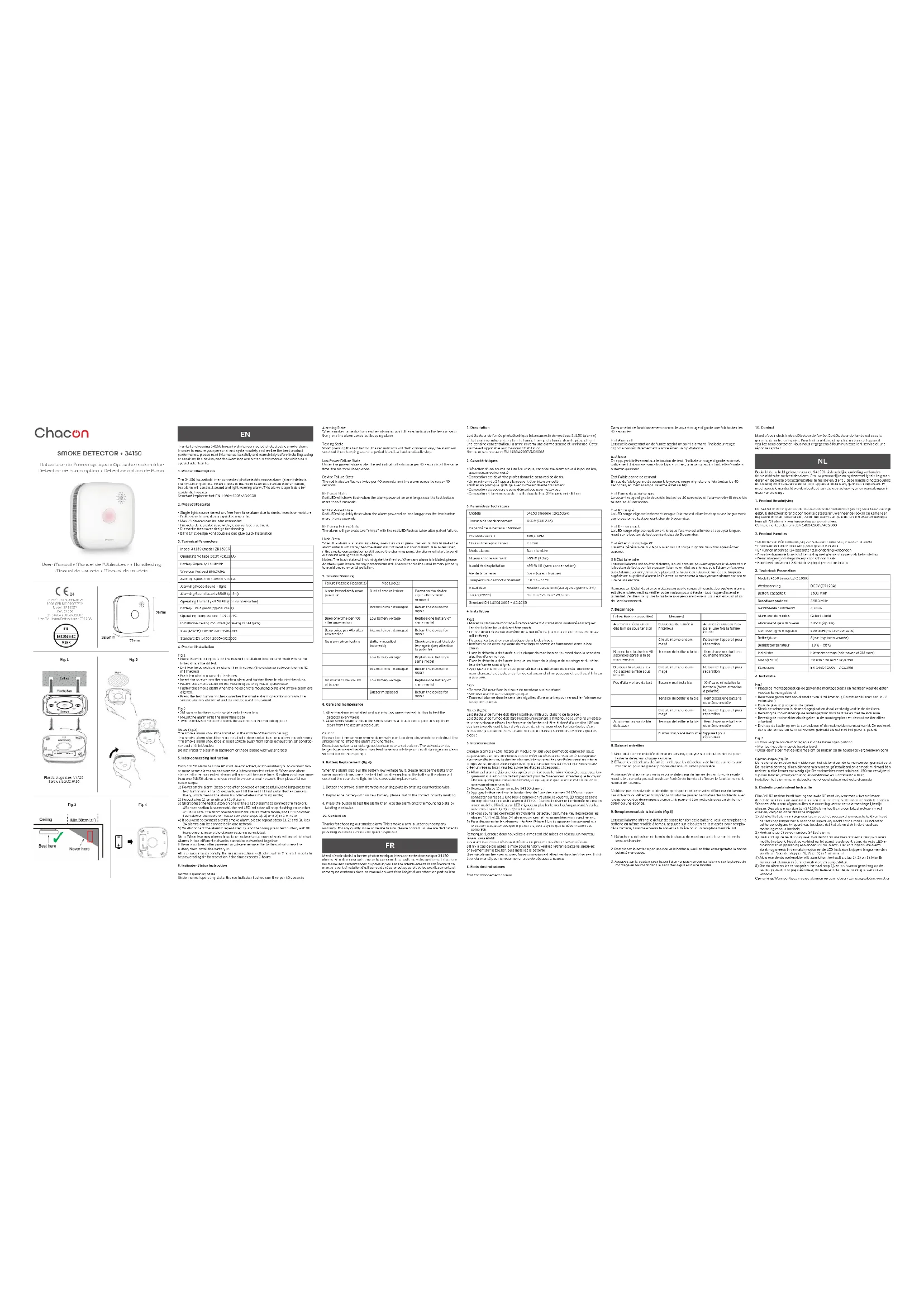 Dans un état de fonctionnement normal, le voyant rouge clignote une fois toutes les 40 secondesÉtat Alarmant Lorsque la concentration de fumée atteint un point alarmant, l’indicateur rouge clignote consécutivement et l’alarme émet un bip d’alarme.État Essai En appuyant brièvement sur le bouton de test, l’indicateur rouge clignotera consé-cutivement, l’alarme enverra trois bips sonores , une période plus tard, elle s’arrêtera automatiquement.État Faible panne de courant En cas de faible panne de courant, le voyant rouge clignote une fois toutes les 40 secondes, en même temps, l’alarme émet un bip.État Panne de périphérique Le voyant rouge clignote deux fois toutes les 40 secondes et l’alarme retentit deux fois toutes les 40 secondes.État RF couplé La LED rouge clignote lentement lorsque l’alarme est allumée et appuyez longuement sur le bouton de test pendant plus de 5 secondes.État RF non coupléLa LED rouge clignote rapidement lorsque l’alarme est allumée et appuyez longue-ment sur le bouton de test pendant plus de 5 secondes.État échec du couplage RF L’alarme générera deux « bips » avec la LED rouge clignote deux fois après échec apparié.6.9 État faire taire Lorsque l’alarme est en état d’alarme, les utilisateurs peuvent appuyer brièvement sur le bouton de test pour faire passer l’alarme en état de silence, puis l’alarme n’enverra pas d’alarme sonore, 9 minutes plus tard, si la concentration de fumée est toujours supérieure au point d’alarme, le l’alarme commencera à envoyer une alarme sonore et lumineuse encore.Remarques : L’état de silence n’atténuera pas le risque d’incendie. Lorsqu’une alarme est déclenchée, veuillez vérier votre maison pour détecter tout risque d’incendie potentiel. Veuillez manipuler la batterie usagée correctement pour éviter la pollution de l’environnement. 7. Dépannage Échec Raisons possibles) Mesures)Alarme immédiatement dès la mise sous tensionBeaucoup de fumée à l'intérieurAllumez à nouveau l'ap-pareil une fois la fumée retiréeCircuit interne endom- magé Retourner l'appareil pour réparationBip une fois toutes les 40 secondes après la mise sous tensionTension de batterie faible Remplacez une batterie du même modèleBip deux fois toutes les 40 s après la mise sous tensionCircuit interne endom- magé Retourner l'appareil pour réparation Pas d'alarme lors du test Batterie mal installée Vériez et réinstallez la batterie (faites attention à polarité)Tension de batterie faible Remplacez une batterie du même modèleCircuit interne endom- magé Retourner l'appareil pour réparationAucun son ou son faible du buzzerTension de batterie faible Remplacez une batterie du même modèleBuzzer mal placé Retourner l'appareil pour réparation8. Soins et entretien 1. Une fois l’alarme installée et mise en service, appuyez sur le bouton de test pour tester le détecteur chaque semaine.2. Eacer les détecteurs de fumée : nettoyez les détecteurs de fumée au moins une fois par an pour les garder propres de l’accumulation poussière.Prudence: Veuillez ne pas enduire votre détecteur de fumée de peinture, de revête-ment, etc. , car cela pourrait obstruer l’entrée de fumée et aecter le fonctionnement normal de l’alarme.N’utilisez pas de solvants ou de détergents pour nettoyer votre détecteur de fumée. Les solvants ou détergents imprégnant l’alarme peuvent entraîner des incidents avec le capteur ou des dommages au circuit. Ils peuvent être nettoyés avec un chion en coton ou une éponge. 9. Remplacement de la batterie (g.4)Lorsque l’alarme ache le défaut de basse tension de la batterie, veuillez remplacer la batterie du même modèle à temps, appuyez sur le bouton de test après avoir rempla-cé la batterie, l’alarme enverra le son et la lumière pour un remplacement réussi.1. Détachez le détecteur de fumée de la plaque de montage en le tournant dans le sens antihoraire.2. Remplacez la batterie par une nouvelle batterie, veuillez faire correspondre la bonne polarité marquage.3. Appuyez sur le bouton pour tester l’alarme, puis verrouillez l’alarme sur la plaque de montage en tournant dans le sens des aiguilles d’une montre.1. Description Le détecteur de fumée photoélectrique interconnecté domestique 34150 (alarme) détecte un incendie en détectant la fumée. Lorsque la fumée dans la pièce atteint une certaine concentration, l’alarme enverra une alarme sonore et lumineuse. Cette alarme est applicable aux maisons d’habitation.Norme mise en œuvre : EN 14604:2005/AC:20082. Caractéristiques • Détection d’une source de lumière unique, sans fausse alarme due à la poussière, aux insectes ou humidité• Conception de labyrinthe professionnelle, sens rapide de feu• Un maximum de 24 appareils peuvent être interconnecté• Boîtier en plastique ignifuge avec surface brillante traitement• Conception de couvercle sans démontage pour nettoyage• Conception à torsion aveugle + colle double face 3M rapide installation3. Paramètres Techniques Modèle 34150 (modèle : ZR150SR)Tension de fonctionnement DC3V (CR123A)Capacité de la batterie 1600mAhProtocole sans l 868,3 MHzCourant de repos moyen < 20uAMode alarme Son + lumièreNiveau sonore alarmant ≥85dB (à 3m)humidité d'exploitation ≤95 % HR (sans condensation)Vie de la batterie 5 ans (valeur typique)Température de fonctionnement -10 °C ~ 55 °CInstallation Fixation au plafond (vissage ou gomme 3M)Taille (L*W*H) 76 mm * 76 mm * 28,5 mmStandard EN 14604:2005 + AC:20084. InstallationFig.1• Placez la plaque de montage à l’emplacement d’installation souhaité et marquez l’endroit où les trous doivent être percé.• Percez deux trous d’un diamètre de 4 millimètres. (La distance entre eux est de 42 millimètres)• Poussez les bouchons en plastique dans le des trous.• Insérez les vis dans la plaque de montage et serrez-les fermement dans le bou-