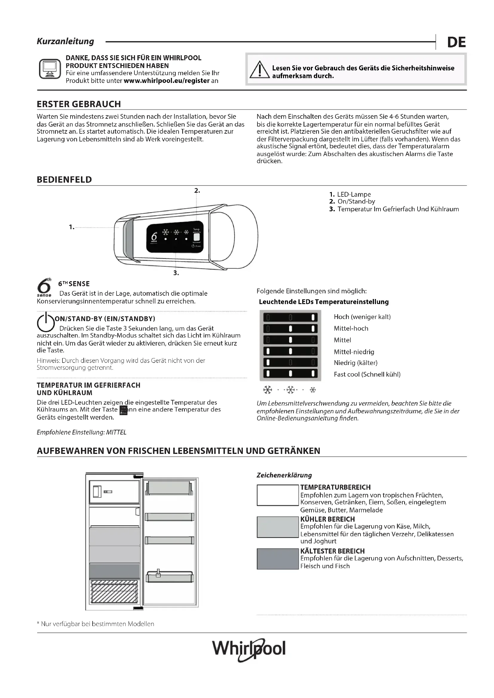 An de proter d'une assistance complète, veuillez enregistrer votre appareil sur www . whirlpool . eu/ register Lisez attentivement les instructions avant d’utiliser l’appareil. 1ÈRE UTILISATION Attendre au moins deux heures après l’installation avant de brancher l’appareil à l’alimentation électrique. Brancher le four à l’alimentation électrique démarre le fonctionnement automatiquement. Les températures idéales de stockage des aliments sont préréglées en usine. Après avoir allumé l’appareil, vous devez patienter de 4 à 6 heures pour atteindre la température de conservation appropriée pour un appareil normalement rempli. Selon le modèle, placez le ltre anti-odeurs et antibactérien dans le ventilateur comme illustré sur l’emballage du ltre. Si le signal sonore retentit, cela signie que l’alarme de température est intervenue: appuyez sur le bouton pour éteindre les alarmes sonores.