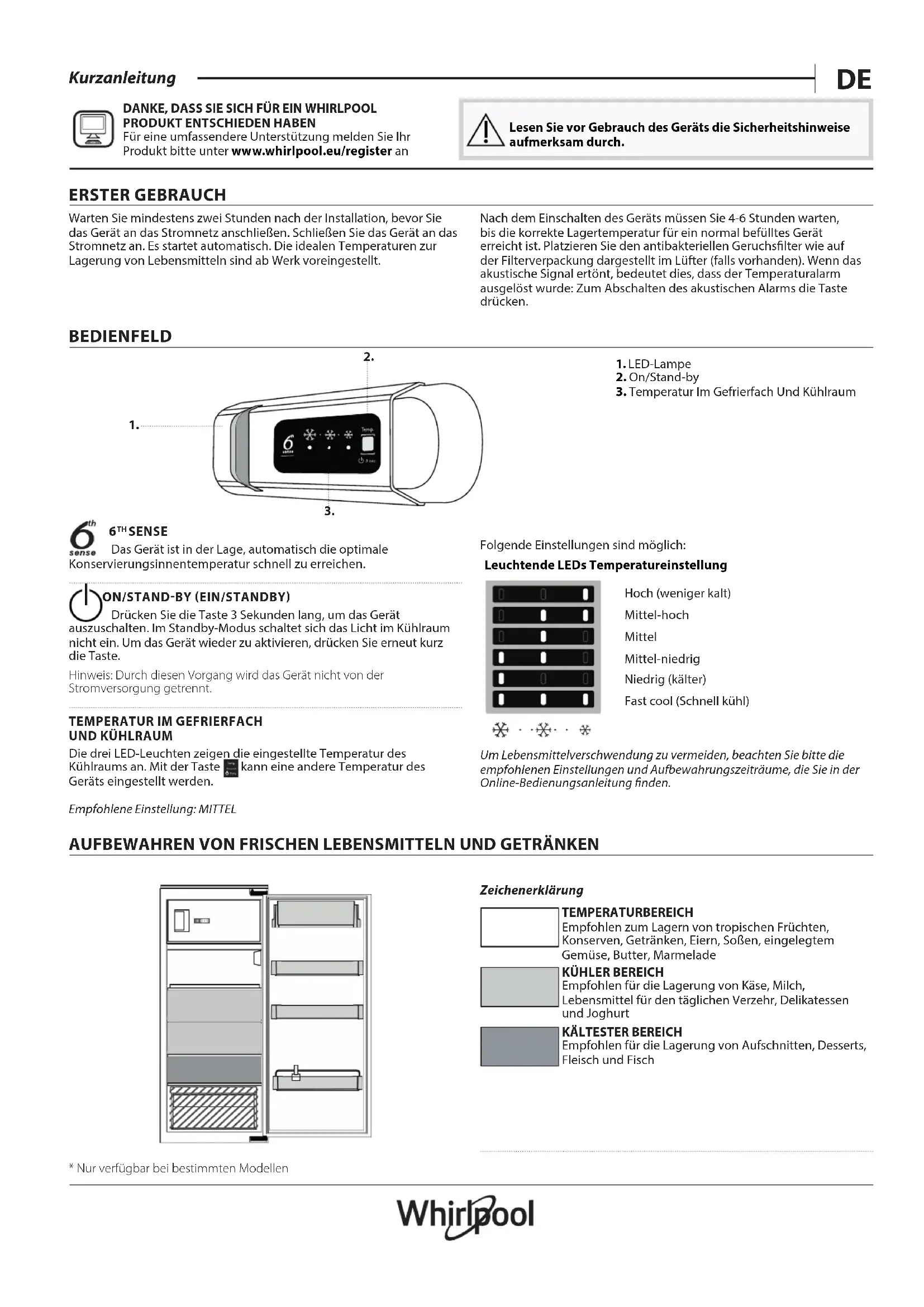 An de proter d'une assistance complète, veuillez enregistrer votre appareil sur www . whirlpool . eu/ register Lisez attentivement les instructions avant d’utiliser l’appareil. 1ÈRE UTILISATION Attendre au moins deux heures après l’installation avant de brancher l’appareil à l’alimentation électrique. Brancher le four à l’alimentation électrique démarre le fonctionnement automatiquement. Les températures idéales de stockage des aliments sont préréglées en usine. Après avoir allumé l’appareil, vous devez patienter de 4 à 6 heures pour atteindre la température de conservation appropriée pour un appareil normalement rempli. Selon le modèle, placez le ltre anti-odeurs et antibactérien dans le ventilateur comme illustré sur l’emballage du ltre. Si le signal sonore retentit, cela signie que l’alarme de température est intervenue: appuyez sur le bouton pour éteindre les alarmes sonores.