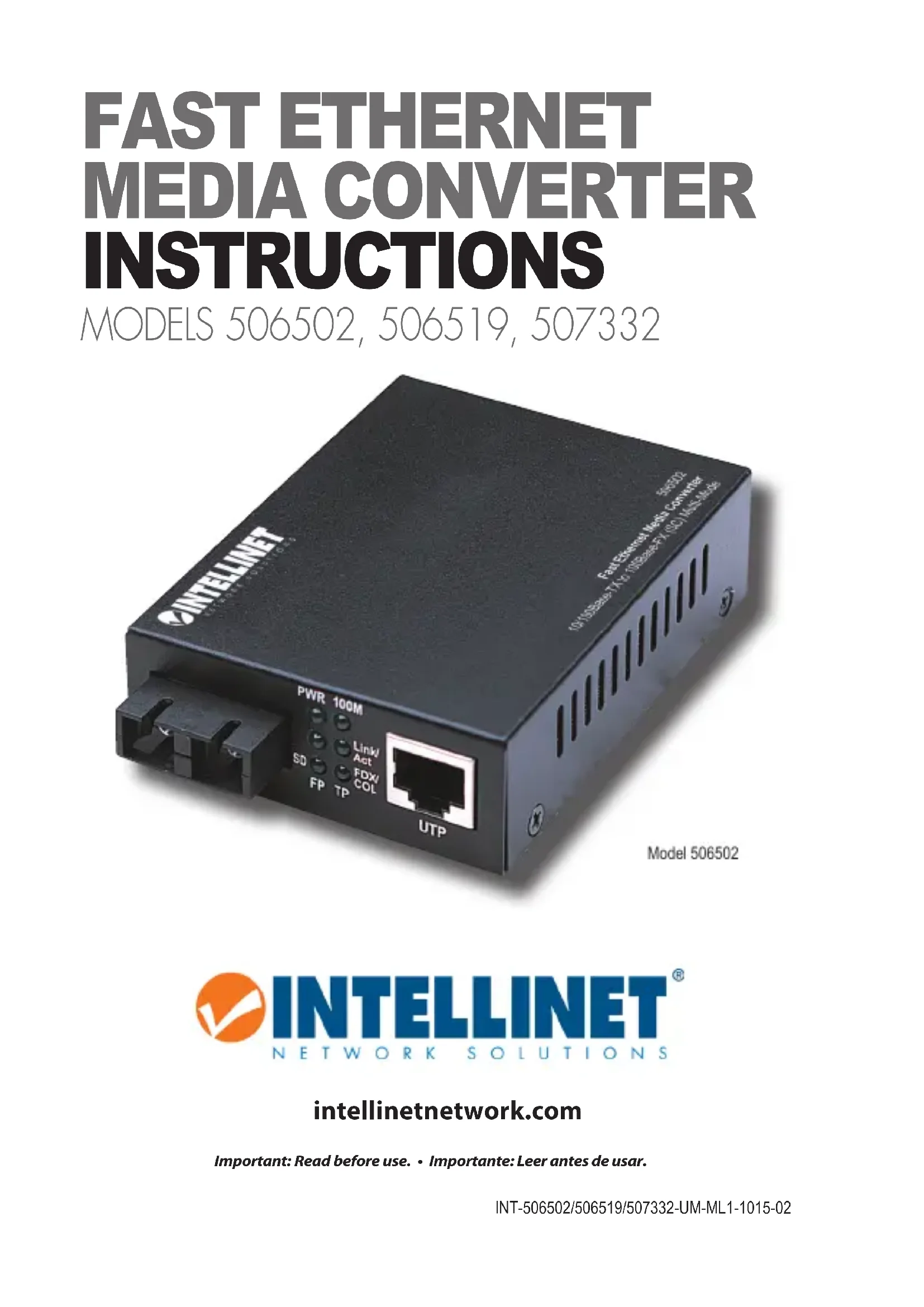 identiques. Établissez une connexion du convertisseur 1 TX au convertisseur 2 RX et du convertisseur 1 RX au convertisseur 2 TX. Les longueurs maximales et spécifications de câble de fibre dépendent au modèle (cf. Modèles). ALIMENTATION Branchez l’adaptateur secteur 5 V DC à la prise d’entrée du con- vertisseur et puis à une prise d’alimentation régulière (90 – 265 V, 50/60 Hz). Utilisez uniquement l’adaptateur secteur inclus ou un correspondant aux spécifications (puissance de sortie 5 Vcc, au moins 1 A). DELS PWR – Allumée si l’adaptateur secteur est connecté. 100M – Allumée en cas de liaison 100 Mbit/s à la connexion paires torsadées; pas allumée en cas de liaison 10 Mbit/s ou d’aucune liaison. Link/Act(TP=RJ45;FP=Fibre) – Allumée en cas de liaison active; clignotant en cas de transmission de données; pas allumée s’il n’y a pas de liason de réseau active. FDX/COL(forTP/RJ45) – Allumée en cas de connexion Full duplex; clignotant en cas de collisions de données; pas allumée en cas de half duplex. SD(pourFP/Fibre) – Allumée si signal optique est détecté; autrement pas allumée. Vous trouvez les spécifications sur intellinetnetwork.com.10 POLSKI Media Konwerter Fast Ethernet Polski Dziękujemy za zakup Media Konwertera Fast Ethernet Intellinet. Za pomocą kabli optycznych Media Konwertery łączą na duże odległości dwie sieci Ethernet. MODELE