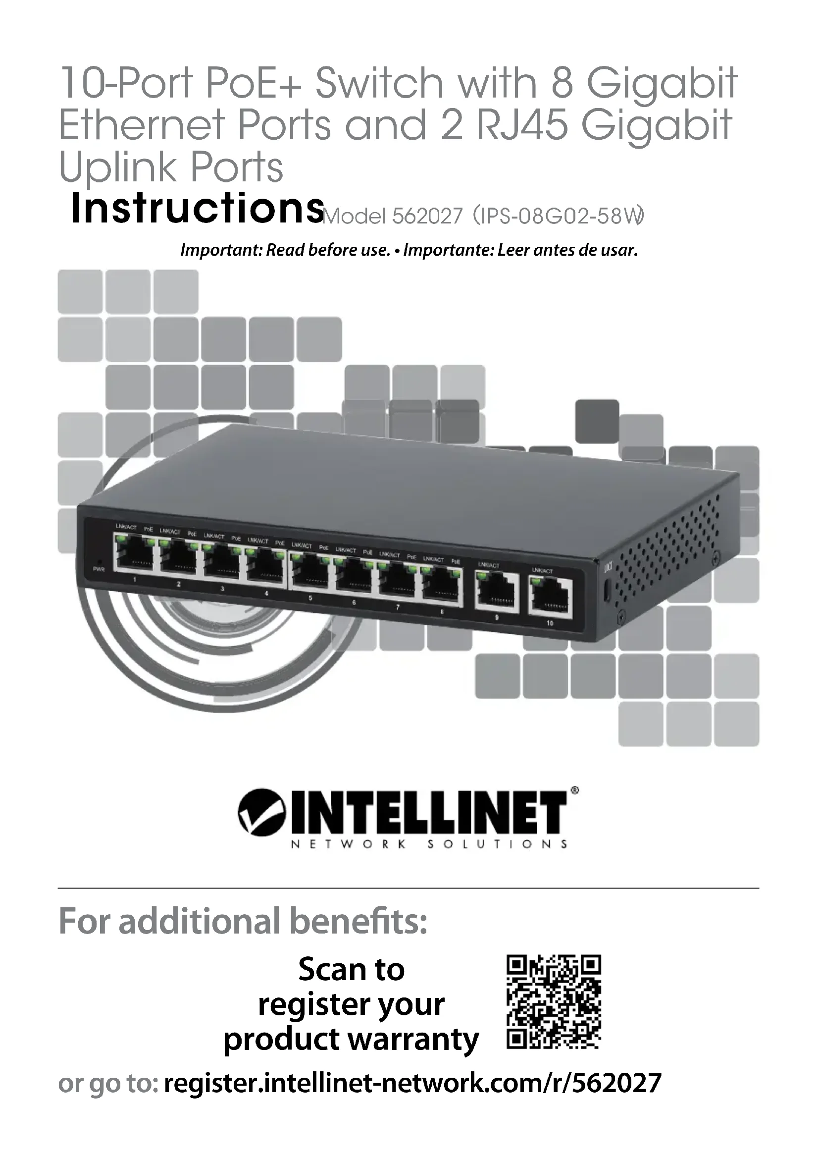 - donde puede verse afectado por la humedad excesiva. Mode Operación Normal Todos los puertos pueden comunicarse entre sí Flow control Deshabilitar el control de flujo, todos los puertos pueden comunicarse entre sí VLAN Los puertos 1 a 8 están aislados entre sí, pero pueden comunicarse con los puertos 9 y 108 Français Instructions Panneau avant Les DEL Les voyants d’état simplient lire les fonctions et les connexions. Les ports Tous les ports de ce commutateur prennent en charge la fonctionnalité Auto-MDI/MDI-X, donc des câbles croisés et des liaisons montantes ne sont pas nécessaires pour des connections aux PC, routeurs, etc. Des câbles Cat5e/6/6a UTP/STP garantissent des performances optimales; si un DEL n’indique pas un connexion, vériez l’appareil correspondans. Panneau arrière Alimentation Utilisez le cordon d’alimentation inclus pour connecter l’entrée d’alimentation au panneau arrière du commutateur Ce guide décrit les bases pour configurer et opérer cet appareil. Pour obtenir le manuel utilisateur et des spécifications, visitez intellinet-network.com. Enregistrez votre produit sur register.intellinet-network.com/r/562027 ou scannez le code QR figurant sur la couverture. LED Couleur Status Operation PWR Verte Allumé Appareil est alimenté Éteint Éteindre Link/ Act Verte Allumé Connexion est établie Clignotant En train d’émettre ou de recevoir des données Éteint Connexion n’est pas établie PoE Verte Allumé L’appareil connecté est alimenté Éteint Port n’est connecté pas à un appareil PSE/PoE9Français Instructions à une prise de courant et confirmez que la DEL s’allume. Vis de châssis/Mise à la terre Câblez la borne de mise à la terre à un objet de mise à la terre pour éviter les pointes de tension. VLAN Mode Le Switch permet l’isolation de port, également appelée « VLAN privé ». Cette fonctionnalité permet d’isoler tous les ports les uns des autres et autorise uniquement l’accès au port de liaison montante. Cette fonction est notamment utile si un VLAN privé est un hôtel où chaque chambre ou suite dispose d’un port réseau pour accéder à Internet. Tous les ports peuvent accéder à Internet, mais ils ne peuvent pas communiquer les uns avec les autres. Placement Avant d’utiliser le commutateur, il est recommandé de le placer: