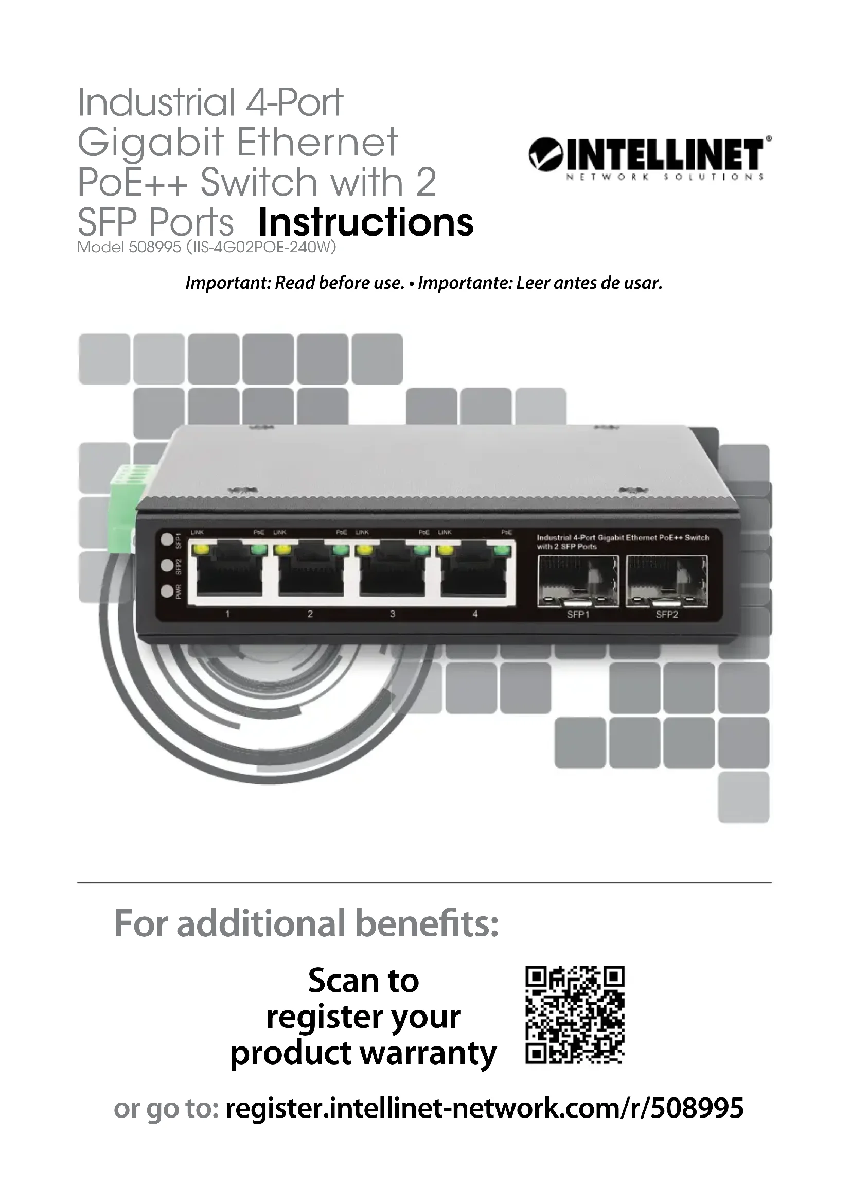 Español Instrucciones8 Instructions L’Intellinet Commutateur industriel 4 ports Ethernet Gigabit PoE++ avec 2 ports SFP propose toute une gamme de fonctionnalités assurant le débit optimal de votre réseau, ainsi qu’un gain notable de temps et d’argent. Pas besoin de configuration, puisque l’installation se fait en plug and play. Traits