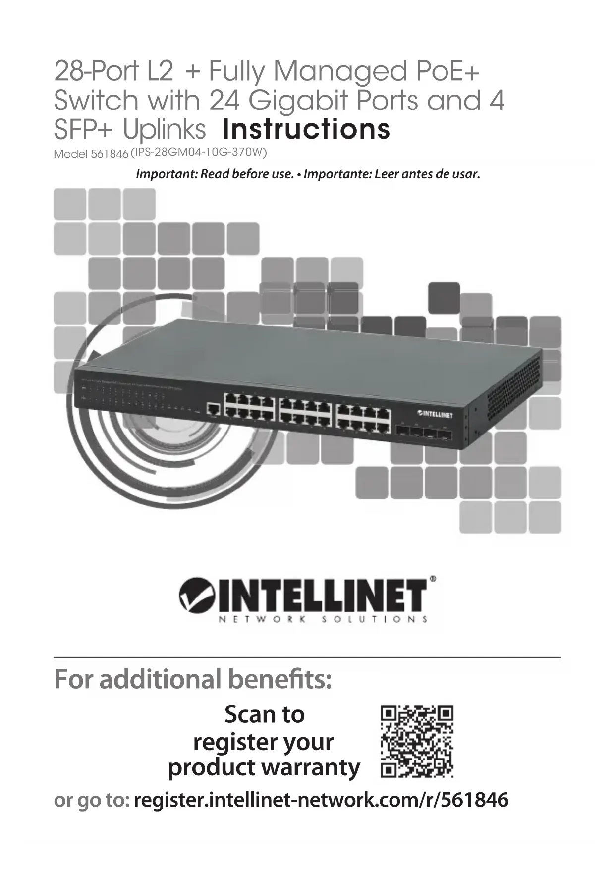 Español Instrucciones8 Français Ce guide décrit les bases pour configurer et opérer cet appareil. Pour obtenir le manuel utilisateur et des spécifications, visitez intellinet-network.com. Enregistrez votre produit sur register.intellinet-network.com/r/561846 ou scannez le code QR figurant sur la couverture. Placement Avant d’utiliser le commutateur, il est recommandé de le placer: