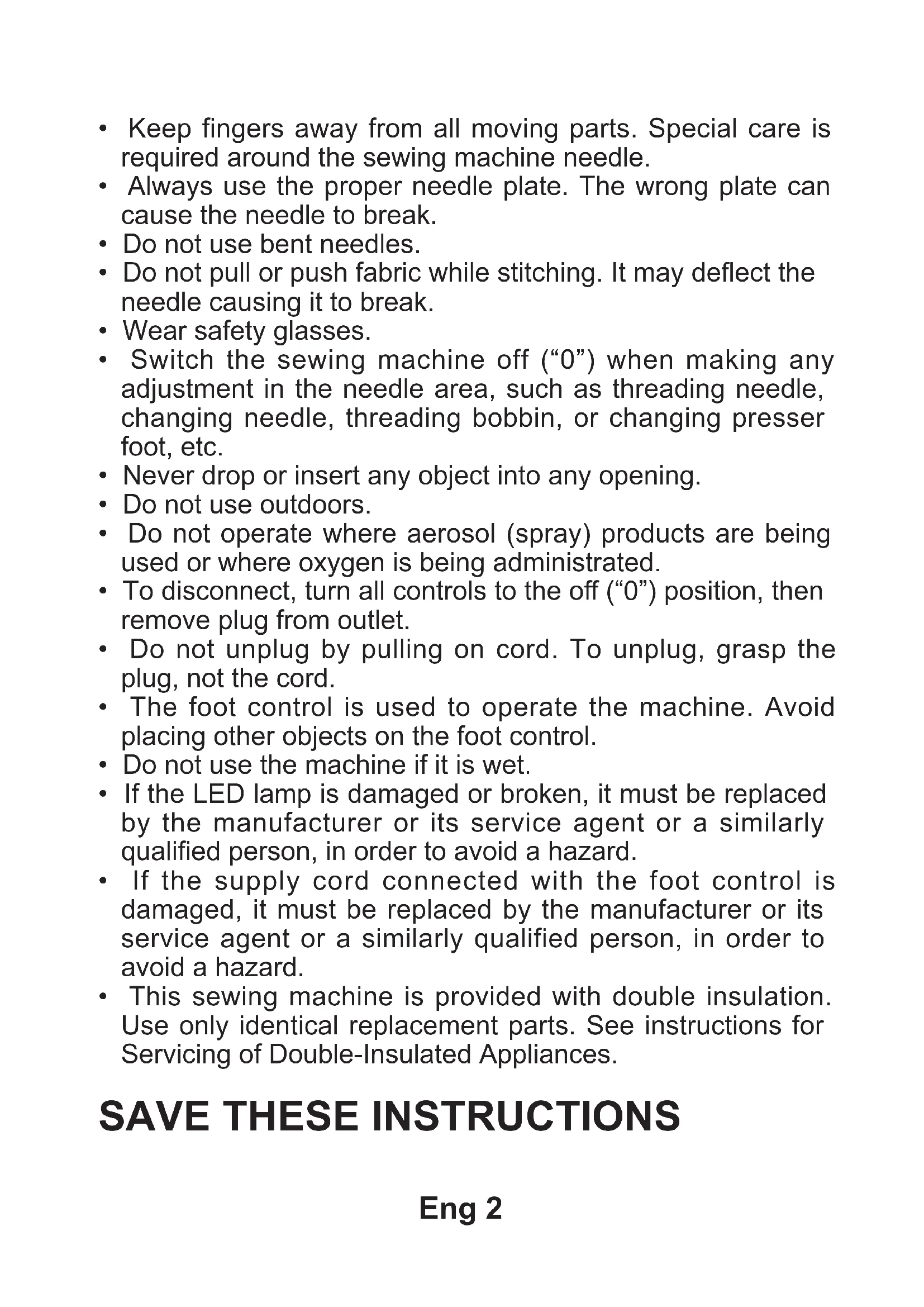 - N’utilisez cette machine à coudre que pour son usage prévu, comme décrit dans ce manuel. N’utilisez que les accessoires recommandés par le fabricant, conformément aux indications fournies dans ce manuel.Fre 2