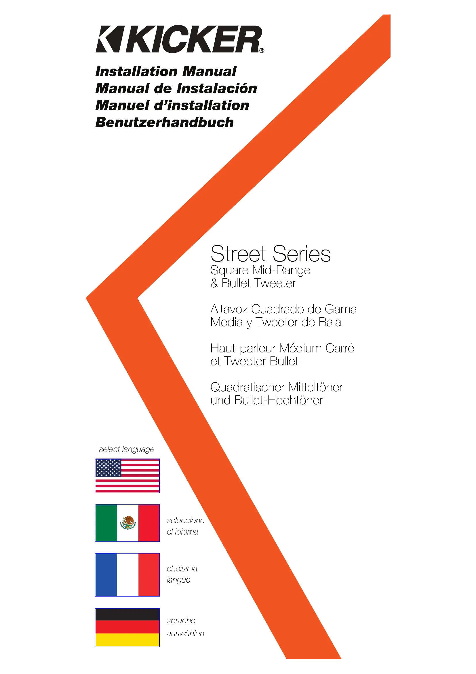 L'AUDITION QUE L'ÉCOUTE D'UN SYSTÈME SANS DISTORSION AU MÊME VOLUME. LE SEUIL DE LA DOULEUR INDIQUE TOUJOURS QUE LE NIVEAU SONORE EST TROP ÉLEVÉ ET POURRAIT ENDOMMAGER VOTRE AUDITION DE MANIÈRE IRRÉVERSIBLE. VEUILLEZ RÉGLER LE VOLUME SONORE EN FAISANT PREUVE DE BON SENS. Les enceintes série ST Street de KICKER sont le dernier ajout à la gamme innovante et complète d'enceintes mobiles et PA de KICKER. Les haut-parleurs d'aigus à membrane en dôme et à pavillon et haut-parleurs de médiums de 180 et 230mm (7 et 9po) ont été conçus pour des installations personnalisées dans des endroits difficiles. La conception carrée ultra-efficace des haut-parleurs et les haut-parleurs d'aigus à compression poussés à travers un pavillon, éliminent le bruit ambiant, le bruit de la foule et tout ce qui peut entraver le son. Que vous souhaitiez améliorer un système audio existant ou en installer un nouveau, ces haut-parleurs sont conçus pour être installés dans des espaces à l'air libre et monter le son! Nous espérons que vous avez la possibilité d'associer ces nouveaux haut-parleurs avec notre gamme primée d'amplificateurs et d'accessoires pour tirer le meilleur profit de votre nouveau système!34Français Spécifications Remarque: toutes les spécifications et valeurs de performance sont sujettes à modification. Veuillez vous rendre sur www.kicker.com pour les informations les plus récentes. Pour tirer les meilleures performances de vos nouveaux haut-parleurs KICKER, nous vous recommandons d'utiliser des accessoires et du câblage KICKER authentiques. Veuillez laisser deux semaines de rodage aux haut-parleurs afin de leur permettre d'atteindre leurs performances optimales. Astuce de pro: il ne vous manque plus qu'un amplificateur KICKER et quelques câbles pour bénéficier d'une mise à niveau totale de votre installation, qui surpassera tout système d'origine! Avec la gamme d'amplificateurs KICKER, il devient facile de doter votre source d'origine ou existante de basses surpuissantes. Demandez également à votre distributeur de vous parler des améliorations que constituent les caissons de graves KICKER. Haut‑parleurs ST ST7MB ST9MB ST3TW ST4TW Haut-parleur de graves [mm ; pouces] 180 ; 7 230 ; 9Haut-parleur d'aigus [mm; po] 25; 1 38; 1,5Puissance en crête [W] 500 600 100 100Puissance d'amplificateur recommandée [W RMS] 50–250 50–300 15–50 15–50Sensibilité [1W, 1m] 92 94 106 108 Réponse en fréquence [Hz] 80–7,5k 80–5,5k 3,5k–20k 3k–20k Diamètre du trou de montage [mm; pouces] 139; 5-7/16 168; 6-5/8 4-5/8 X 6-9/16148 X 167 Profondeur de montage [mm; po] 81; 3-3/16 93 ; 3-11/16 85 ; 3-3/8 Impédance nominale [Ω] 4 ou 8 4 ou 8 4 4 Matériau de la bobine Ferrite Ferrite Ferrite Ferrite Matériau du cône du haut-parleur de graves Pâte pressée Pâte pressée Matériau d'enveloppe du haut-parleur de graves Tissu traité Tissu traité Matériau du dôme du haut-parleur d'aigus Aluminium AluminiumConception du haut-parleur d'aigus Membrane en dômeMembrane en dôme35Français Configuration du câblage Nous vous recommandons d'utiliser un câble de calibre16 (ou plus). Les haut-parleurs de la gamme médium ST ont une impédance nominale de 4 ou 8ohms et fonctionnent avec tous types de sources ou d'amplificateurs conçus pour fonctionner à la charge ohm respective. Assurez-vous que l'impédance de votre source ou amplificateur soit compatible avec la charge ohm adéquate pour le fonctionnement. Veillez à faire courir le câble de raccordement du haut-parleur dans un lieu exempt de véhicules ou autres mécanismes. Si vous ne disposez pas de câble de haut-parleur d'usine à l'emplacement que vous souhaitez, il peut être nécessaire de faire courir le câble du haut-parleur via le montant de la portière. Le câble du haut-parleur doit être maintenu à distance des bords tranchants et éviter tout risque de pincement par la portière. Un passe-câble présent dans le montant de la portière constitue le lieu idéal pour faire courir le câble du haut-parleur. S'il n'y a pas de passe-câble et de trou d'usine, ou s'ils sont inaccessibles, vous devrez percer un trou pour faire courir le câble du haut-parleur via le montant de la portière. Faites attention à ne pas percer un autre câble ou un mécanisme de portière existant. Chaque fois qu'un câble est passé à travers un trou, il est nécessaire d'insérer un passe-câble en plastique ou en caoutchouc pour protéger le câble des dégâts. Installation36Français Câblage du haut‑parleur d'aigus Les haut-parleurs d'aigus de la série ST incluent un condensateur pour une utilisation en tant que filtre passe-haut passif, protégeant le haut-parleur d'aigus des basses fréquences et fournissant la meilleure réponse de fréquence pour le haut-parleur d'aigus en lien avec les médiums. Alignez le condensateur avec le câble d'entrée positive du haut-parleur d'aigus comme indiqué. condensateur condensateurrésistance vers l'amplificateur vers l'amplificateur Si le niveau sonore du haut-parleur d'aigus est trop élevé, installez le condensateur et la résistance en série avec le câblage d'entrée positif du haut-parleur d'aigus comme indiqué.37Français Montage des haut‑parleurs Les haut-parleurs KICKER ST sont conçus pour les applications à l'air libre dans des installations personnalisées et ils ne nécessitent pas d'enceinte étanche pour délivrer des performances optimales. Il est important que le son provenant de l'avant du haut-parleur soit isolé de celui qui rayonne à l'arrière de celle-ci. La meilleure façon d'y parvenir est de monter les haut-parleurs soit aux emplacements d'origine du véhicule, soit dans un espace semi-isolé à l'arrière (comme la plage arrière d'une voiture, derrière la banquette). Si vous remplacez des haut-parleurs d'usine à leur emplacement d'origine, vous devrez probablement modifier le trou de montage de façon à ce qu'il s'adapte au haut-parl