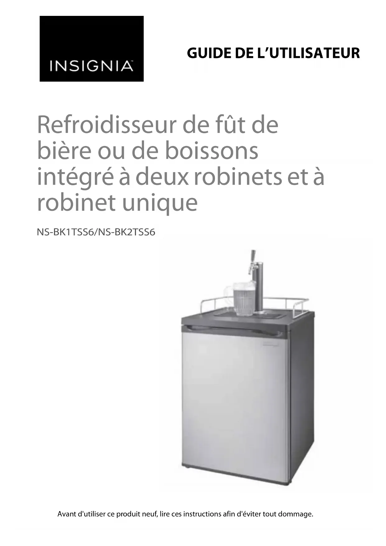 Refroidisseur de fût de bière ou de boissons intégré à deux robinets et à robinet www.insigniaproducts.com Introduction Félicitations d'avoir acheté ce produit Insignia de haute qualité. Les modèles NS-BK1TSS6 or NS-BK2TSS6 représentent la dernière avancée technologique dans la conception de refroidisseurs de fût de bière ou de boissons intégrés et ont été conçus pour des performances et une fiabilité exceptionnelles. Instructions de sécurité importantes AVERTISSEMENT 1 Lire ces instructions. 2 Conserver ces instructions. 3 Respecter tous les avertissements. 4 Observer toutes les instructions. 5 Ne pas utiliser cet électroménager près de l’eau. 6 Nettoyer uniquement avec un chiffon humide. 7 Ne pas obstruer les ouvertures d'aération. Installer l’ensemble conformément aux instructions du fabricant. 8 Installer l’appareil à l’écart de sources de chaleur, telles que radiateurs, bouches de chaleur, fours ou autres appareils (y compris les amplificateurs) qui produisent de la chaleur. 9 Ne pas chercher à modifier le dispositif de sécurité de la prise polarisée ou de type mise à la terre. Une prise polarisée comporte deux plots, un plus large que l'autre. Une prise de type mise à la terre est composée de deux plots et d’un troisième de mise à la terre. La lame large ou le AT TENTION