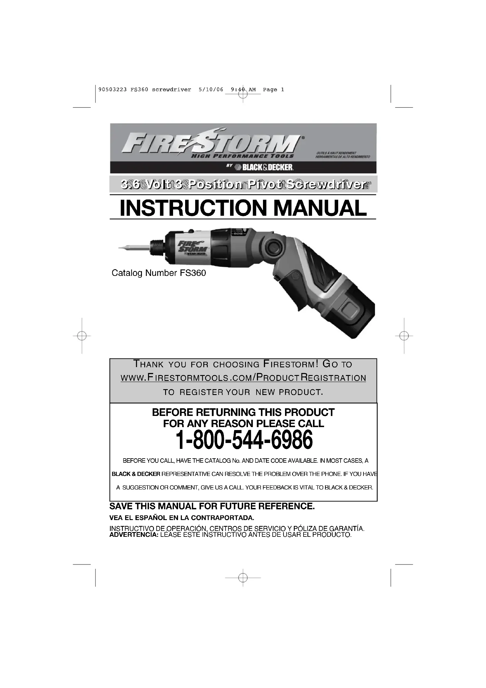 ou tout autre produit Black & Decker destiné aux consommateurs et réservé à un usage résidentiel, utilisé dans le cadre d’une ACTIVITÉ RELIÉE AU TRAVAIL, N’EST PAS COUVERT PAR LA PRÉSENTE GARANTIE. Imported by / Importé par Black & Decker Canada Inc. 100 Central Ave. Brockville (Ontario) K6V 5W6 Voir la rubrique “Outils électriques” des Pages Jaunes pour le service et les ventes. 90503223 FS360 screwdriver 5/10/06 9:40 AM Page 2324
