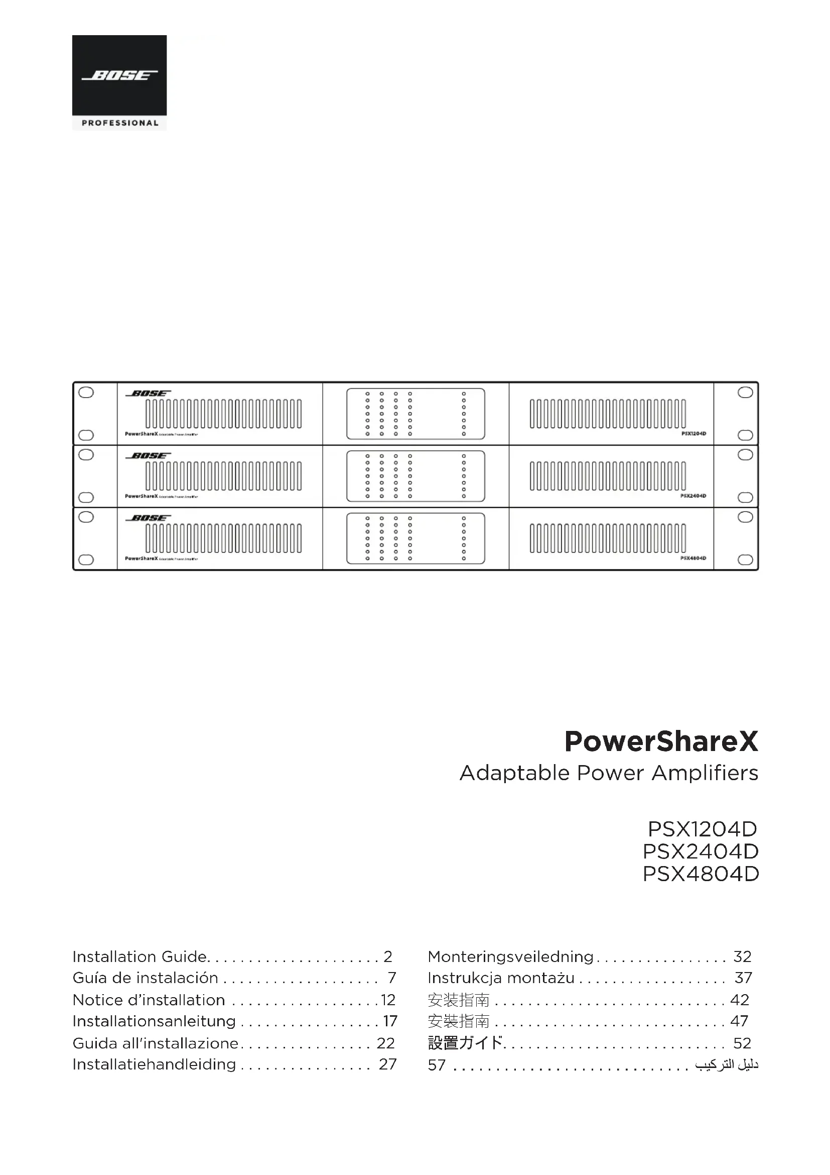 - Cuando vaya a limpiar los filtros de ventilación, tire de las placas frontales del panel para retirarlas del amplificador, ya que de ese modo se soltarán los imanes. Utilice aire comprimido para eliminar el polvo de los filtros o lávelos con agua limpia. Deje que se sequen completamente antes de reinstalarlos.12 • Français PowerShareX PSX1204D/PSX2404D/PSX4804D • Guide d’installation Consignes de sécurité importantes BoseProfessional.com Merci de lire et de conserver le manuel d’instruction et de respecter les consignes de sécurité. L’installation de ce produit doit être eectuée par un technicien professionnel! Ce document a été écrit pour fournir aux techniciens professionnels les directives de montage et de sécurité relatives à ce produit, dans le cadre d’une installation fixe typique. Veuillez lire ce document, ainsi que l’ensemble des avertissements de sécurité avant de procéder à l’installation.