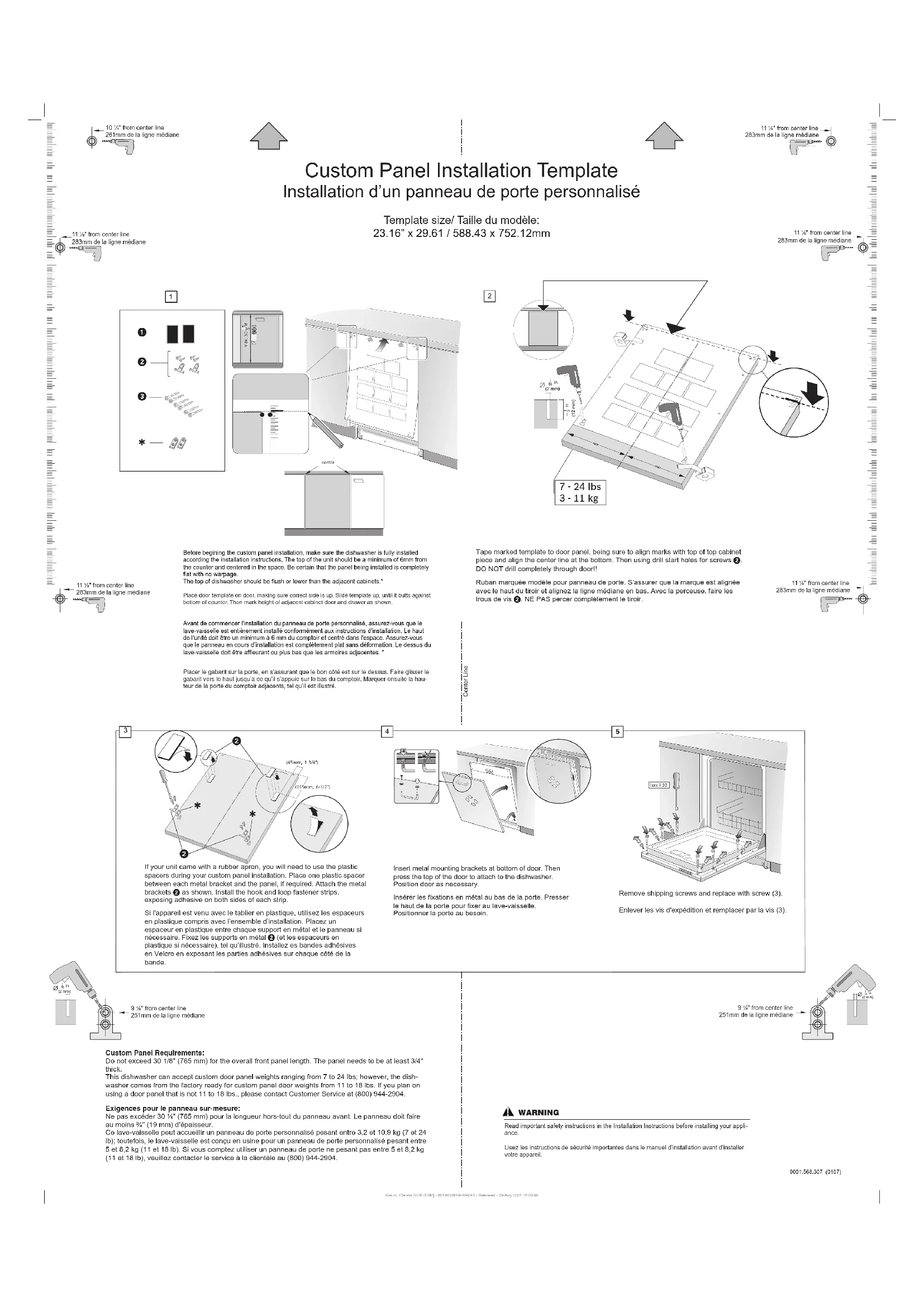 Before begining the custom panel installation, make sure the dishwasher is fully installed according the installation instructions. The top of the unit should be a minimum of 6mm from the counter and centered in the space. Be certain that the panel being installed is completely flat with no warpage.The top of dishwasher should be flush or lower than the adjacent cabinets.* Place door template on door, making sure correct side is up. Slide template up, until it butts against bottom of counter. Then mark height of adjacent cabinet door and drawer as shown. Avant de commencer l'installation du panneau de porte personnalisé, assurez-vous que le lave-vaisselle est entièrement installé conformément aux instructions d'installation. Le haut de l'unité doit être un minimum à 6 mm du comptoir et centré dans l'espace. Assurez-vous que le panneau en cours d'installation est complètement plat sans déformation. Le dessus du lave-vaisselle doit être affleurant ou plus bas que les armoires adjacentes. * Placer le gabarit sur la porte, en s’assurant que le bon côté est sur le dessus. Faire glisser le gabarit vers le haut jusqu’à ce qu’il s’appuie sur le bas du comptoir. Marquer ensuite la hau-teur de la porte du comptoir adjacents, tel qu’il est illustré. Custom Panel Installation Template Installation d’un panneau de porte personnalisé Template size/ Taille du modèle: 23.16” x 29.61 / 588.43 x 752.12mm 10 ¼" from center line261mm de la ligne médiane11 ¹⁄8" from center line283mm de la ligne médiane11 ¹⁄8" from center line283mm de la ligne médiane9 ⁷⁄8" from center line251mm de la ligne médiane 9 ⁷⁄8" from center line251mm de la ligne médiane11 ¹⁄8" from center line283mm de la ligne médiane11 ¹⁄8" from center line283mm de la ligne médiane11 ¹⁄8" from center line283mm de la ligne médianeKreutz, Christa [GDE-SRM] - 60100009194996/A1 - Released - 29.Aug.2022 16:00:50