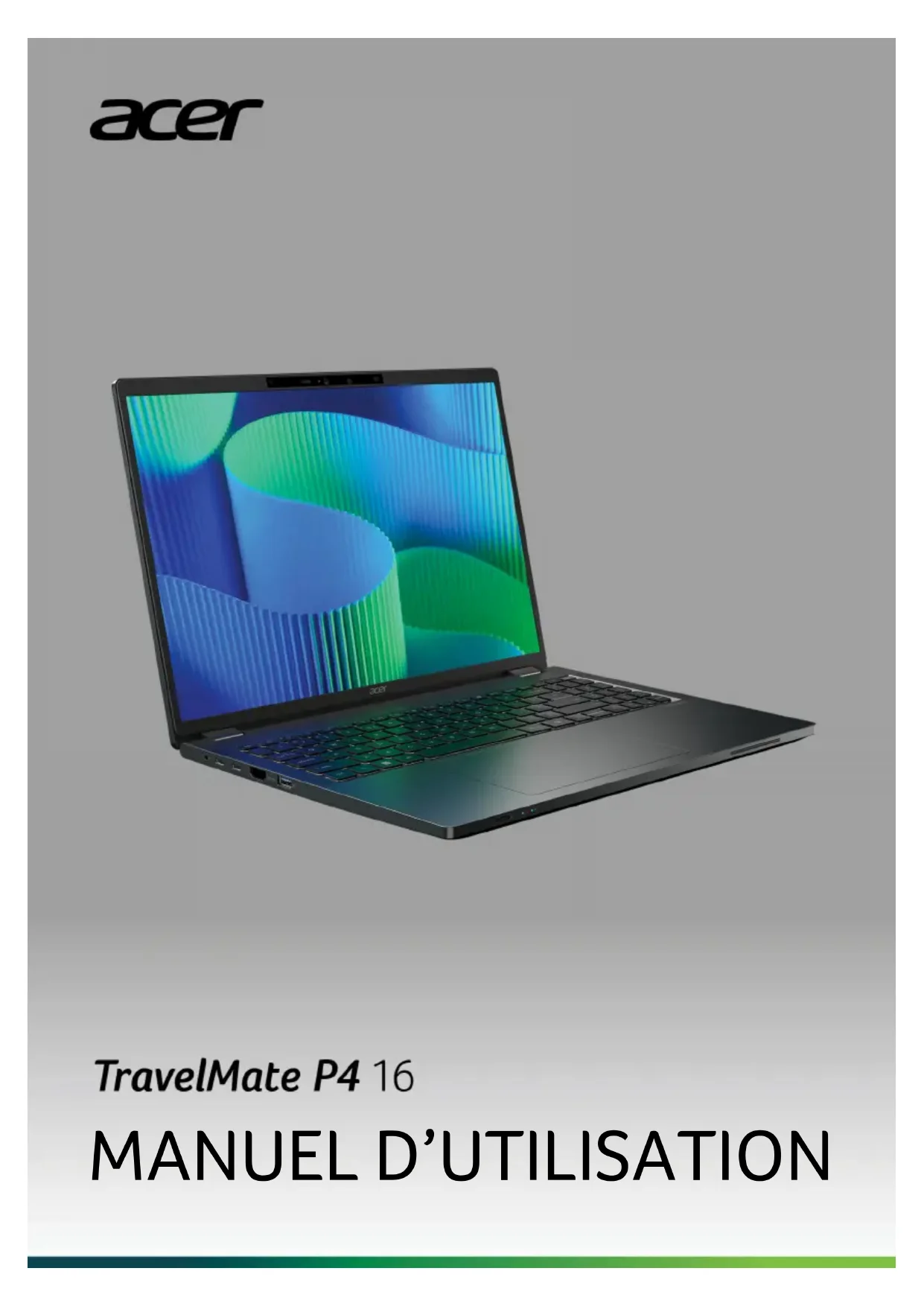 © 2024. Tous droits réservés. TravelMate P4 16 Couvre : P416-53 / P416-53-TCO Cette révision : 05/2024 Important Ce manuel contient des informations propriétaires qui sont protégées par les lois sur le copyright. Les informations contenues dans ce manuel peuvent être modifiées sans préavis. Certaines fonctionnalités décrites dans ce manuel peuvent ne pas être prises en charge en fonction de la version du système d’exploitation. Les images fournies ici sont pour référence seulement et peuvent contenir des informations ou des fonctionnalités qui ne s’appliquent pas à votre ordinateur. Le Groupe Acer ne peut être tenu responsable des erreurs ou omissions techniques ou éditoriales contenues dans ce manuel. Numéro de modèle : ____________________________ Numéro de série : ______________________________ Date d’achat : _________________________________ Lieu d’achat : __________________________________ Les termes HDMI et High-Definition Multimedia Interface ainsi que le logo HDMI sont des marques commerciales ou des marques déposées de HDMI Licensing Administrator, Inc. aux États-Unis et dans d’autres pays.Table des matières - 3
