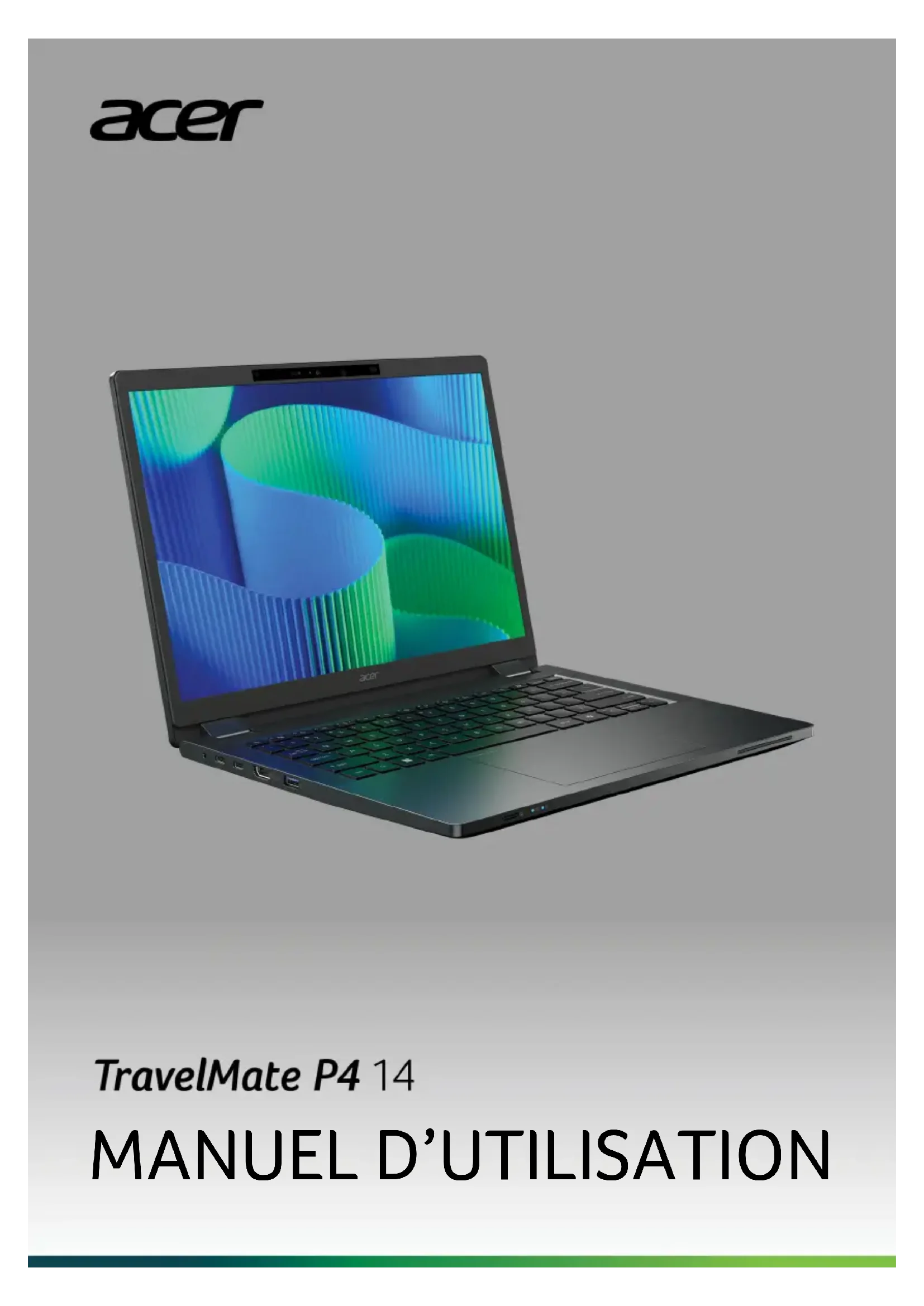 © 2024. Tous droits réservés. TravelMate P4 14 Couvre : P414-53-G2 / P414-53-G2-TCO Cette révision : 04/2024 Important Ce manuel contient des informations propriétaires qui sont protégées par les lois sur le copyright. Les informations contenues dans ce manuel peuvent être modifiées sans préavis. Certaines fonctionnalités décrites dans ce manuel peuvent ne pas être prises en charge en fonction de la version du système d’exploitation. Les images fournies ici sont pour référence seulement et peuvent contenir des informations ou des fonctionnalités qui ne s’appliquent pas à votre ordinateur. Le Groupe Acer ne peut être tenu responsable des erreurs ou omissions techniques ou éditoriales contenues dans ce manuel. Numéro de modèle : ____________________________ Numéro de série : ______________________________ Date d’achat : _________________________________ Lieu d’achat : __________________________________ Les termes HDMI et High-Definition Multimedia Interface ainsi que le logo HDMI sont des marques commerciales ou des marques déposées de HDMI Licensing Administrator, Inc. aux États-Unis et dans d’autres pays.Table des matières - 3