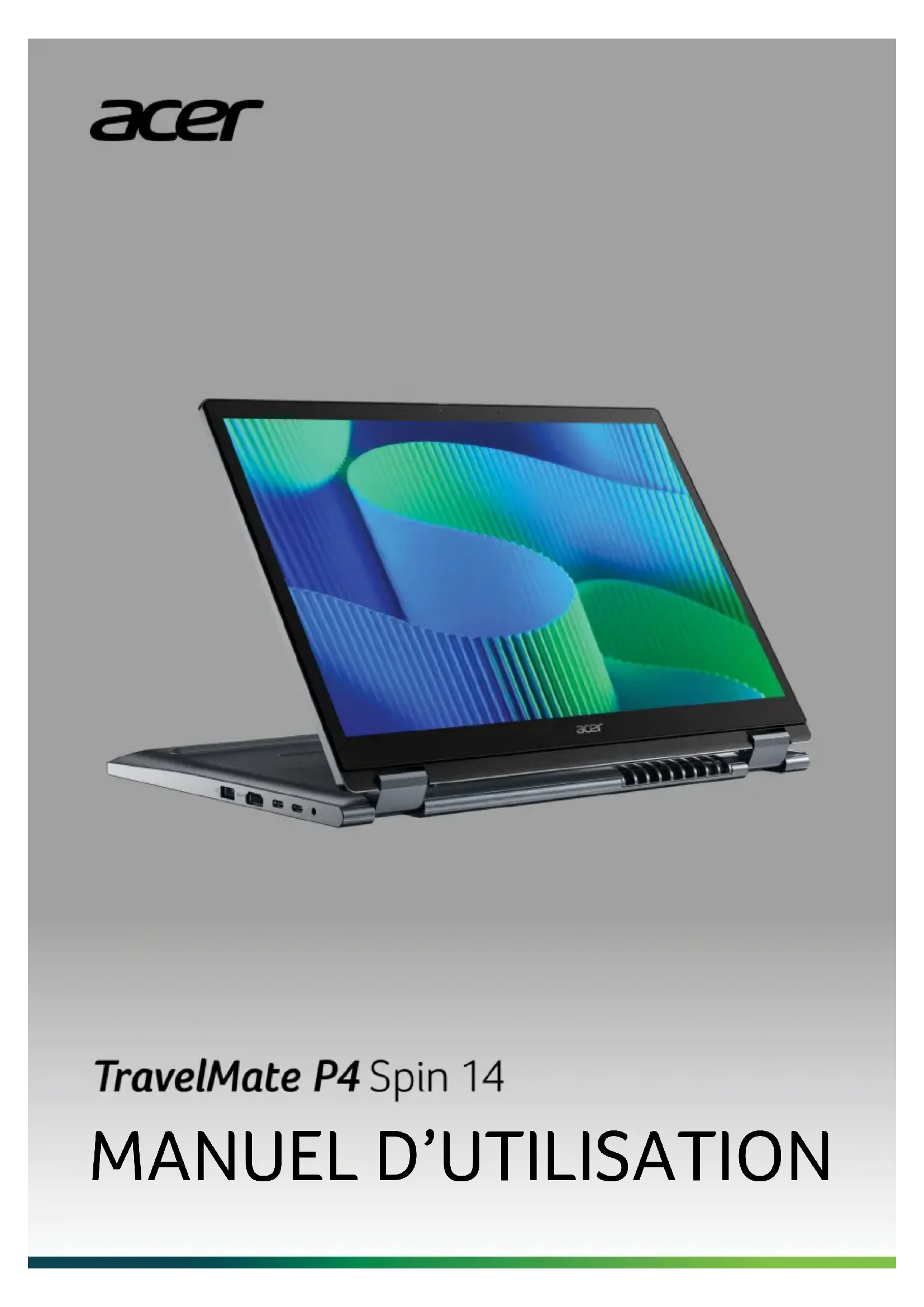 © 2024. Tous droits réservés. TravelMate P4 Spin 14 Couvre : P414RN-54 / P414RN-54-TCO Cette révision : 05/2024 Important Ce manuel contient des informations propriétaires qui sont protégées par les lois sur le copyright. Les informations contenues dans ce manuel peuvent être modifiées sans préavis. Certaines fonctionnalités décrites dans ce manuel peuvent ne pas être prises en charge en fonction de la version du système d’exploitation. Les images fournies ici sont pour référence seulement et peuvent contenir des informations ou des fonctionnalités qui ne s’appliquent pas à votre ordinateur. Le Groupe Acer ne peut être tenu responsable des erreurs ou omissions techniques ou éditoriales contenues dans ce manuel. Numéro de modèle : ____________________________ Numéro de série : ______________________________ Date d’achat : _________________________________ Lieu d’achat : __________________________________ Les termes HDMI et High-Definition Multimedia Interface ainsi que le logo HDMI sont des marques commerciales ou des marques déposées de HDMI Licensing Administrator, Inc. aux États-Unis et dans d’autres pays.Table des matières - 3