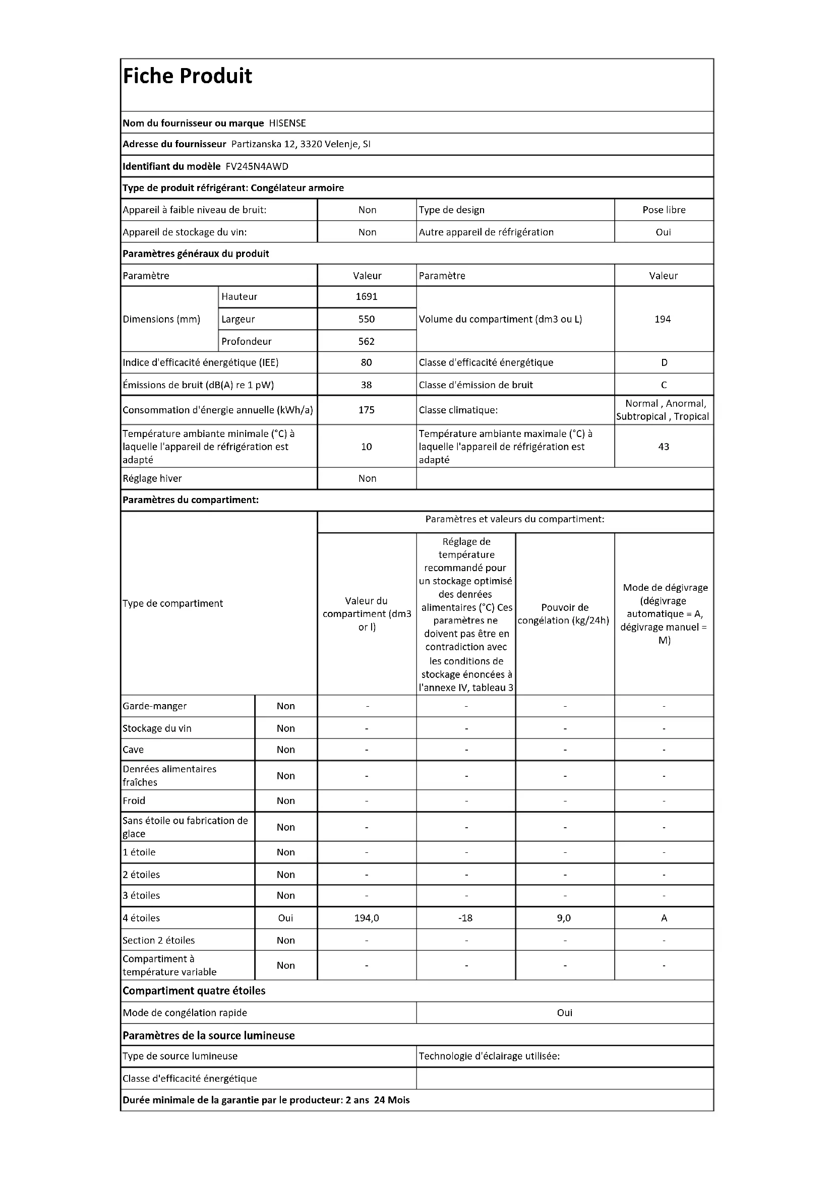 | Caractéristiques techniques | Congélateur vertical HISENSE FV245N4AWD, capacité nette de 245 litres, classe énergétique F, niveau sonore de 42 dB. |