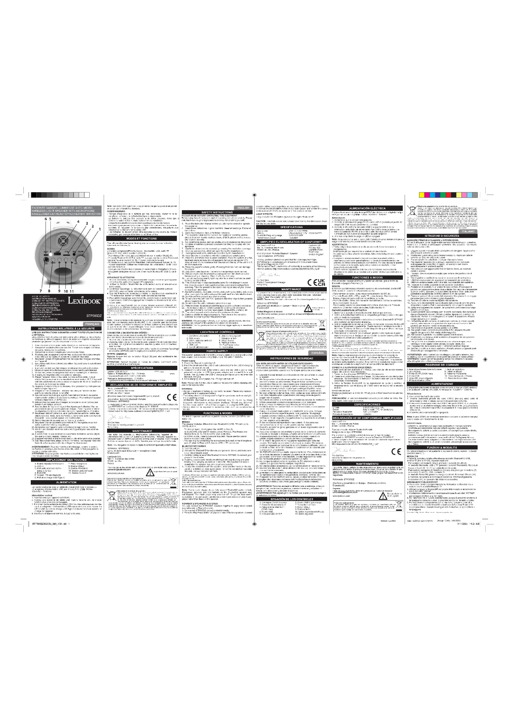 Pour allumer/éteindre l’enceinte et ajuster le volume, tournez le bouton Marche/Arrêt/Volume (1).MODESL’enceinte comprend différents modes : Bluetooth®, USB, carte TF(jusqu’à 32 Go), entrée auxiliaire (AUX IN) - Pour changer de mode, appuyez brièvement sur le bouton M/LED (8).- En mode Bluetooth®, USB et carte TF, appuyez sur les boutons Précédent, Lecture/Pause et Suivant (9, 10, 11) pour contrôler la lecture.- En mode Aux-in, les boutons Précédent, Lecture/Pause et Suivant (9, 10, 11) sont désactivés. Utilisez les commandes de votre lecteur audio pour contrôler la lecture.- Vous pouvez chanter des chansons en connectant le microphone (inclus) à l’appareil via la prise microphone (7) en mode Bluetooth®, USB ou carte T F. APPAIRAGE BLUETOOTH®1. Allumez l’enceinte, un signal sonore retentira pour informer que l’appareil est prêt à être pairé et le voyant LED clignotera.2. Activez la fonction Bluetooth® de votre lecteur audio et assurez-vous d’être visible.3. Conrmez l’appairage ou sélectionnez le nom de l’enceinte portable (BTP585), pour connecter votre lecteur à l’enceinte.4. Une fois le lecteur et l’enceinte connectés, un signal sonore retentira et la LED restera xe. Mettez un chier audio ou vidéo en marche. 5. Pour arrêter l’appairage avec l’enceinte, sélectionnez un autre mode sur le panneau de contrôle ou appuyez sur la touche de déconnexion de votre lecteur audio. La marque et les logos Bluetooth® sont des marques déposées appartenant à Bluetooth SIG, Inc. et Lexibook® les utilise sous licence. Les autres marques de commerce et noms commerciaux appartiennent aux sociétés qui en sont respectivement détentrices.© 2021 Bluetooth SIG, Inc.Votre lecteur audio doit être muni du profile Bluetooth® A2DP pour être compatible avec le karaoké portable. Pour en savoir plus sur comment activer cette fonction, veuillez consulter le manuel d’utilisation de votre lecteur audio.Note : Certains lecteurs de musique ne sont pas entièrement compatibles avec les commandes audio Bluetooth®. Il est possible que les boutons lecture / pause, précédant et suivant sur le haut-parleur ne fonctionnent pas ou que le lecteur de musique s’éteigne. Nous vous conseillons d’utiliser les boutons de lecture de votre lecteur de musique.CONNECTER 2 ENCEINTES EN STÉRÉO :Vous pouvez connecter deux enceintes BTP585DZ ensemble pour proter d’un son stéréo (disponible en mode Bluetooth uniquement) :1. Allumez deux enceintes BTP585DZ simultanément.2. Appuyez deux fois sur le bouton lecture / pause (10) de l’une des deux enceintes. Un signal sonore retentira une fois qu’elles sont connectées avec succès.3. Activez la fonction Bluetooth de votre lecteur audio et conrmez l’appairage à l’enceinte (BTP585) comme expliqué à la section précédente.EFFETS LUMINEUXAppuyez longuement sur le bouton M/LED (8) pour allumer/éteindre les effets lumineux.ATTENTION: Baissez toujours le niveau du volume. Autrement votre audition pourrait être endommagée.Nous, Lexibook® S.A.Bât 11., 6 avenue des Andes 91940 Les Ulis - Francedéclarons sous notre seule responsabilité que le produit :Désignation : Enceinte Bluetooth PortableRéférence : BTP585DZLe soussigné, Lexibook Limited, déclare que l’équipement radioélectrique du type BTP585DZ est conforme à la directive 2014/53/UE. Le texte complet de la déclaration UE de conformité est disponible à l’adresse internet suivante: http://www.lexibook.com/doc/btp585/btp585_1.pdfYiu Wai ManDirecteur du développement du produitHong Kong DÉCLARATION UE DE CONFORMITÉ SIMPLIFIÉE MAINTENANCE Pour éviter tout incendie ou électrocution, débranchez l’appareil de l’alimentation en courant CA quand vous le nettoyez. Nettoyez l’appareil en l’essuyant avec un chiffon à poussière comme pour un meuble. Il est conseillé d’utiliser un savon doux et un chiffon humide pour nettoyer la partie frontale.Note : Veuillez garder ce mode d’emploi, il contient d’importantes informations.Référence : BTP585DZConçu et développé en Europe – Fabriqué en Chine© Lexibook® Lexibook S.A.Bât 11., 6 avenue des Andes 91940 Les UlisFrancePour vos demandes concernant un problème SAV ou une réclamation, écrivez à savcomfr@lexibook.comwww.lexibook.comEntrée USB DC 5.0V 1.0A Batterie Batterie lithium 3.7V, 1200mAh Fréquence Bluetooth® 2402 – 2480 MHzPuissance de transmission -3.26dBmLa puissance de transmission maximale est inférieure à 20mW SPÉCIFICATIONS SAFETY INSTRUCTIONS PLEASE READ BEFORE OPERATING THIS EQUIPMENT.Before using the unit, be sure to read all operating instructions carefully. Please note that these are general precautions and may not pertain to your unit. 1. Read this Instruction Manual before you attempt to connect or operate the appliance.2. Keep these instructions in good condition. Heed all warnings. Follow all instructions.3. Save this Instruction Manual for future reference.4. The apparatus shall not be exposed to dripping or splashing and no objects lled with liquids, such as vases, shall be placed on the product. Dry location use only.5. No naked ame source, such as candles, should be placed on the product.6. Children should be supervised to ensure that they do not play with the appliance.7. Ventilation should not be impeded by covering the ventilation openings.8. Only use accessories, which are specied by the manufacturer.9. Use replacement parts, which are specied by the manufacturer.10. Install the unit in accordance with the manufacturer’s instructions.11. Place the unit where there is good ventilation. Place the system on a at, hard and stable surface. Do not expose to temperatures above 40°C. Allow at least 10 cm clearance from the rear and the top of the unit and 5 cm from each side.12. Press the player’s buttons gently. Pressing them too hard can damage the player.13. Dispose of used batteries in an environmental-responsible manner.14. Always ensure