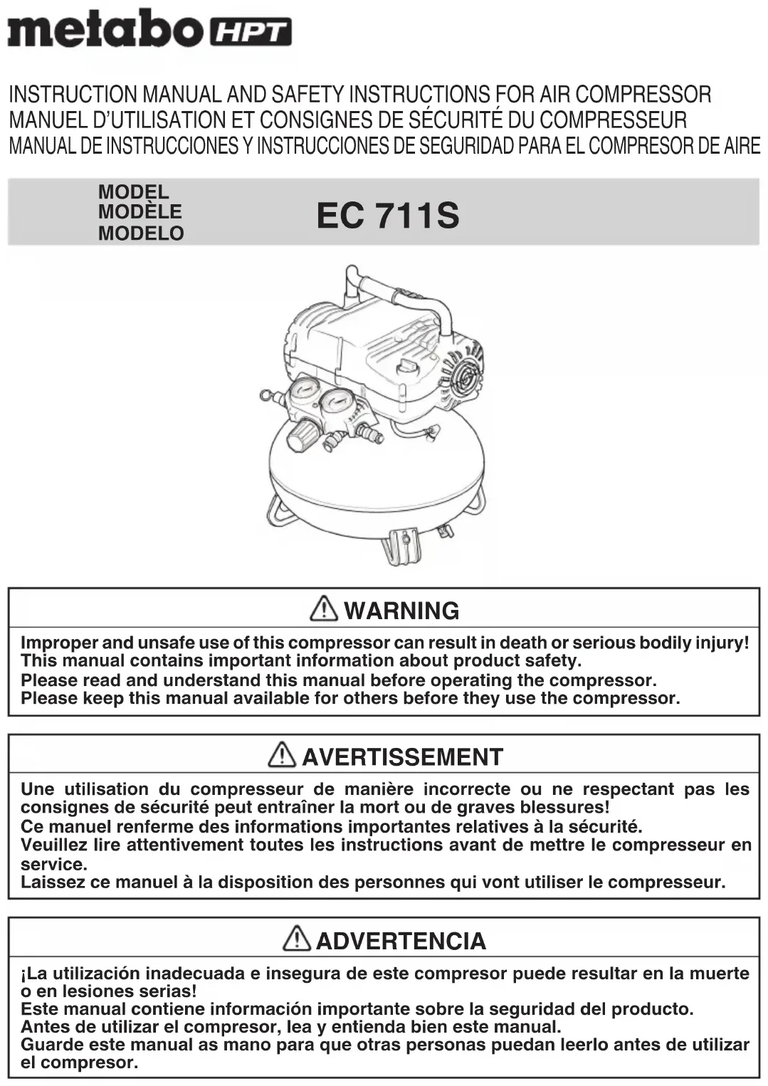 Do not disassemble check valve while air is in tank - empty the all the air out of the tank before dissasembly. There is excessive moisture in the air discharge. There is excessive water in the air tank. The humidity is high. Drain the tank to remove water. Move the compressor to an area of less humidity or use an air line fi lter to reduce moisture discharge in the tank. Air is leaking from the compressor. The hose connection is loose or improperly sealed. The air hose is broken or damaged. Ensure connections are sealed with thread sealing tape and tightened. Replace the air hose. The compressor runs continuously The tank drain valve is open. The pressure switch is defective. The usage is excessive. Ensure the tank drain valve is closed. Take the compressor to a service center. Decrease the amount of tool run-time; the compressor is not large enough to supply the air requirement of the tool. The compressor vibrates. The compressor mounting bolts are loose. Tighten mounting bolts. The air output is lower than normal. The inlet valves are broken. The connections are leaking. Take the compressor to a service center. Apply thread sealing tape to fi tting and tighten. 00BookEC711SNA.indb1700BookEC711SNA.indb17 2024/03/229:55:262024/03/229:55:2618 Français INFORMATIONS IMPORTANTES Lire attentivement toutes les instructions de fonctionnement, les consignes de sécurité et les mises en garde contenues dans ce manuel avant de faire fonctionner le compresseur ou de procéder à son entretien. La majorité des accident résultant de l’utilisation ou de l’entretien du compresseur sont dus au non respect des consignes et règles de sécurité élémentaires. En identifi ant à temps les situations potentiellement dangereuses et en observant les consignes de sécurité appropriées, on évite bien souvent des accidents. Les consignes élémentaires de sécurité sont décrites dans la section « SÉCURITÉ » de ce manuel ainsi que dans les sections renfermant les instructions d’utilisation et d’entretien. Les situations dangereuses à éviter pour prévenir tout risque de blessure grave ou de dommages de la machine sont signalées par des « AVERTISSEMENT » sur le compresseur et dans el manuel d’utilisation. Ne jamais utiliser le compresseur d’une manière autre que celles spécifi quement recommandées par metabo HPT, à moins de s’être préalablement assuré que l’utilisation envisagée ne sera dangereuse ni pour soi ni pour les autres.