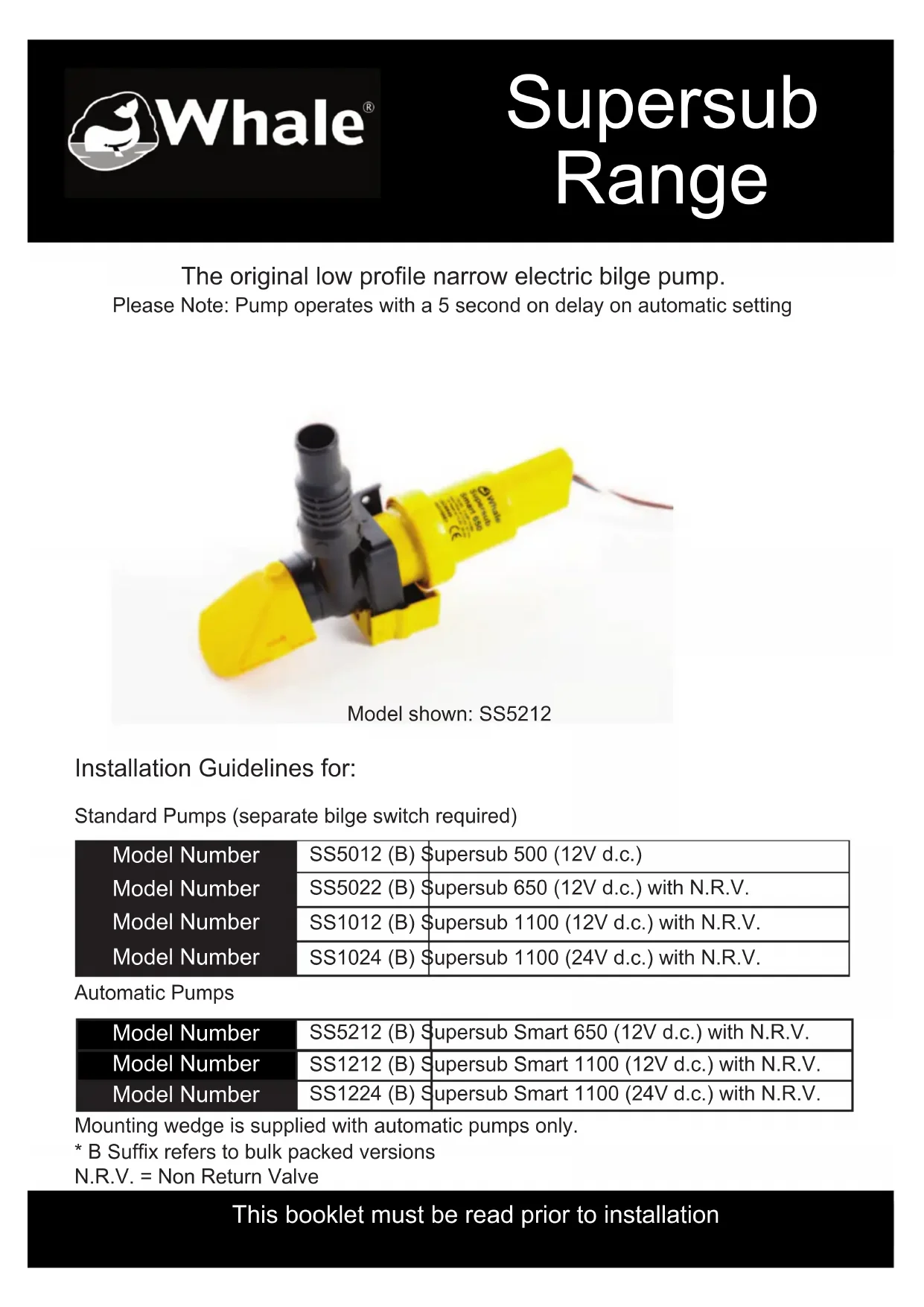 ATTENTION A noter que toute installation incorrecte invalidera la garantie. A L'ATTENTION DE L'INSTALLEUR: Vérifier que le produit correspond à l'application désirée, suivre les instructions d'installation suivantes et s'assurer que le personnel intéressé lise les points ci-dessous. Egalement s'assurer que ces instructions d'utilisation soit données à l'utilisateur. A L'ATTENTION DE L'UTILISATEUR: Lire attentivement les instructions suivantes. Les pompe Supersub 500, 650 et 1100 et Supersub Smart 650 et 1100 sont conçus uniquement, et spécifiquement pour une évacuation rapide et efficace des eaux de cale pour les embarcations de loisir. La gamme Supersub se loge dans des espaces étroits et bas dans lesquelles d'autres pompes de cales ne peuvent se mettre. SS5012, SS5022, SS1012 ET SS1024 N'EST PAS UNE POMPE AUTOMATIQUE. (Référez-vous à la
