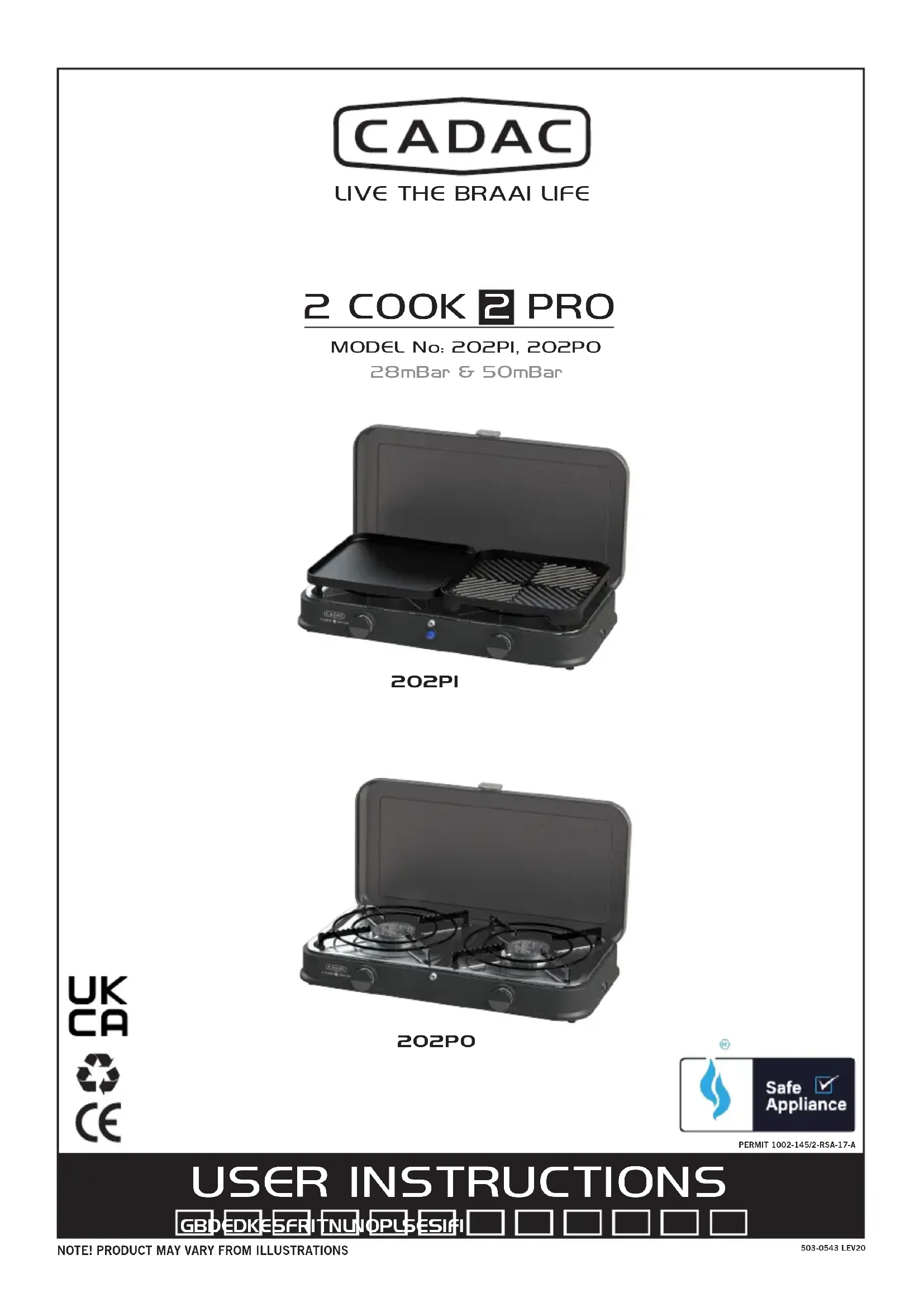 CADAC (Pty) Ltd garantit par le présent document à l’ACHETEUR ORIGINAL de cet appareil à gaz CADAC, qu’il sera exempt de défaut matériel et de fabrication à compter de la date d’achat, comme suit: Robinets: 2 Years Pièces en plastique: No Warranty Pièces en émail: 2 Years Brûleurs: 1 Year La garantie ne s’appliquera que si l’unité est assemblée et utilisée conformément aux instructions imprimées. CADAC peut demander une preuve raisonnable de votre date d’achat. AUSSI, VOUS DEVEZ CONSERVER VOTRE TICKET DE CAISSE OU VOTRE FACTURE. Cette garantie limitée devra être limitée à la réparation ou au remplacement des pièces qui s’avèrent défectueuses en cas d’utilisation et de service normaux, et qui devront indiquer leur défectuosité lors d’un examen, à la satisfaction de CADAC. Avant de renvoyer toute pièce, contactez le représentant du service à la clientèle de votre région à l’aide des coordonnées fournies avec votre manuel. Si CADAC conrme la défaillance et approuve la demande, CADAC choisira de remplacer de telles pièces sans frais. CADAC renverra les pièces à l’acheteur, transport et frais de port prépayés. Cette Garantie limitée ne couvre aucune défaillance ni difculté de fonctionnement due à un accident, un mauvais traitement, une mauvaise utilisation, une altération, un usage impropre, du vandalisme, une mauvaise installation ou un mauvais entretien ou service, ou la non-réalisation de l’entretien normal et de routine, notamment, mais sans s’y limiter, des dommages causés par des insectes dans les tubes de brûleur, comme exposé dans ce manuel du propriétaire. Une détérioration ou des dommages dus à des conditions météorologiques extrêmes, telles que de la grêle, des ouragans, des tremblements de terre ou des tornades, une décoloration due à une exposition à des produits chimiques soit directement, soit dans l’atmosphère, ne sont pas garantis par cette Garantie limitée. Il n’existe aucune garantie expresse autre qu’indiqué dans le présent document et toute garantie implicite applicable de qualité marchande et d’aptitude à l’emploi est limitée en durée à la période de couverture de cette Garantie limitée écrite expresse. Certaines régions ne permettent pas de limite sur la durée d’une garantie implicite. Aussi, cette limite peut ne pas être applicable dans votre cas. CADAC n’est pas responsable de tout dommage spécial, indirect ou consécutif. Certaines régions n’autorisent pas l’exclusion ou la limitation des dommages indirects ou consécutifs. Aussi, cette limite ou cette exclusion peut ne pas être applicable dans votre cas. CADAC n’autorise aucune personne ni entreprise à assumer toute obligation ou responsabilité de sa part en rapport avec la vente, l’installation, l’utilisation, le retrait, le retour ou le remplacement de son matériel ; et aucune représentation telle ne lie CADAC. La présente garantie s’applique uniquement aux produits vendus au détail. Pour apprécier et garantir la longévité de votre produit CADAC, veuillez vous reporter à la section sur le nettoyage et l’entretien du manuel de l’utilisateur, en portant une attention particulière aux précautions liées à l’acier inoxydable. FR2929 ADVARSEL Sørg for tilstrækkelig udluftning. Dette gasapparat forbruger ilt (oxygen). Brug ikke apparatet i et u-ventileret rum for at undgå at sætte livet på spil. Hvis der etableres ere gasapparater og/eller der kommer ere beboere til, der anvender , skal der sørges for yderligere udluftning. VIGTIGT Læs disse instruktioner omhyggeligt for at gøre dig fortrolig med apparatet før det tilsluttes et en gascylinder. Opbevar disse instruktioner til fremtidig reference.