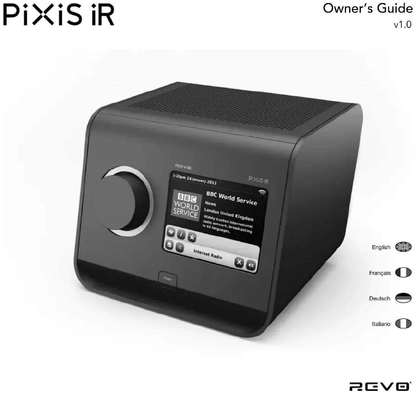 - Link out of date. Check that the Internet is working for a computer connected to the same network. Check the following ports are open: UDP and TCP ports 80 and 123. DNS port 53. Some Internet radio stations may require additional ports to be opened. Try other stations. Try listening on computer via Internet Radio Portal website (see page 10). Try again later.22 EnglishOwner’s Guide v1.0 Français22 Français Support Technique Si vous rencontrez des problèmes en utilisant ce produit, s’il vous plaît référez-vous à la section « élimination de problème » à la page 31 de ce manuel d’utilisation. Sinon, appelez le support technique Revo sur: UK 01555 666161 A l’extérieur de UK + 44 1555 666161 Sinon, e-mail support@revo.co.uk ou visitez la section « élimination de problème » de notre site Web à l’adresse: www.revo.co.uk Infos sur l’environnement INSTRUCTIONS POUR L’ÉLIMINATION DU PRODUIT (directive DEEE) Le symbole représenté ici et sur le produit signifi e qu’il est classé comme équipement électrique ou électronique et ne doit pas être éliminé avec les ordures ménagères ou commerciales à la fi n de sa durée de vie. La directive 2002/96/CE, relative aux déchets d’équipements électriques et électroniques (directive DEEE) a été mise en place pour recycler les produits en utilisant les meilleures techniques de récupération et de recyclage afi n de minimiser l’impact sur l’environnement, de traiter les substances dangereuses et d’éviter le développement des sites d’enfouissement. Pour plus d’informations s’il vous plaît contacter votre autorité locale ou le détaillant où le produit a été acheté. CONFORME RoHS & MARQUAGE CE Ce produit a été conçu pour être conforme aux directives internationales sur la Restriction des Substances Dangereuses (RoHS) et a été conçu et testé pour se conformer aux exigences européennes et porte le marquage CE