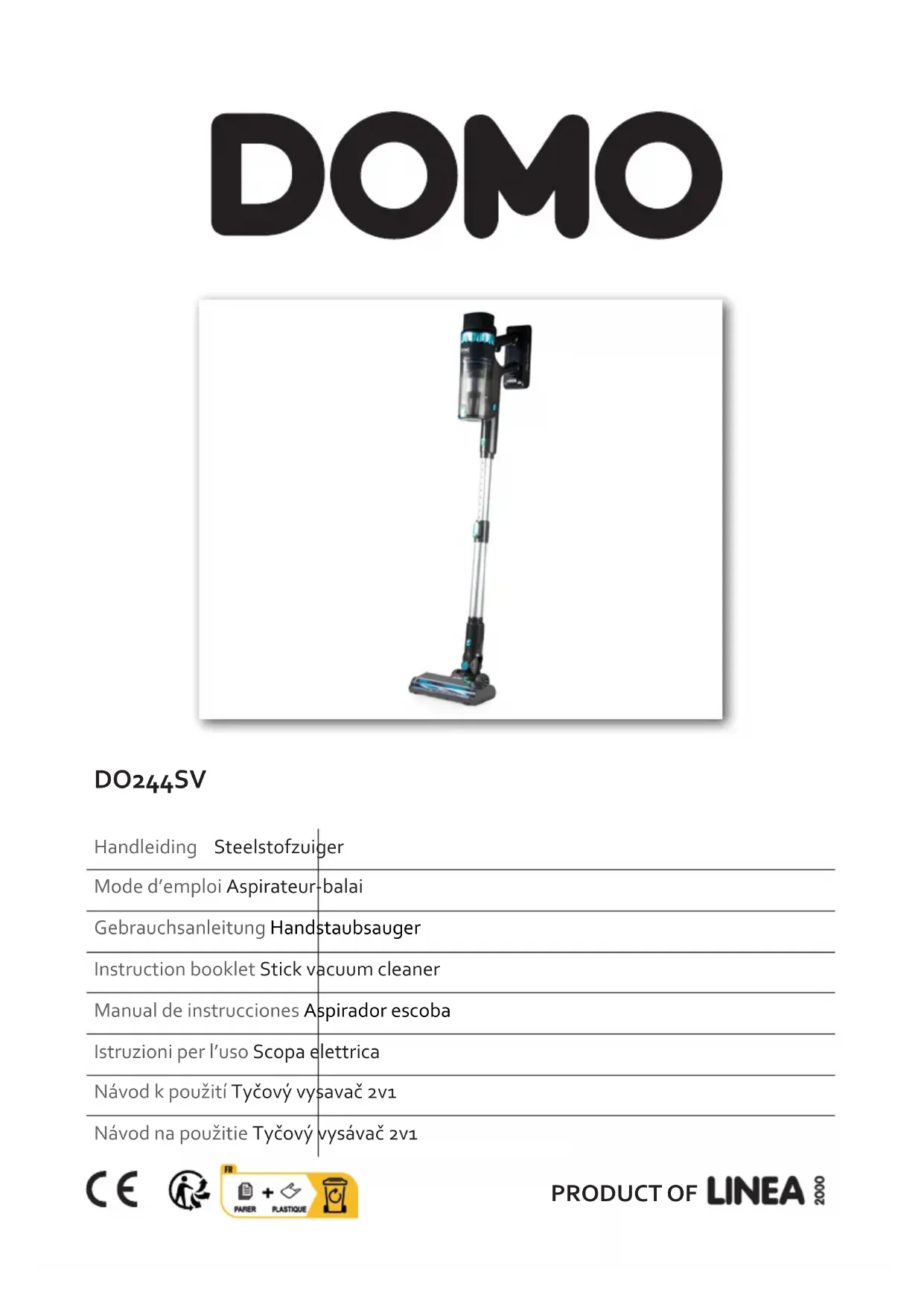 Ce symbole sur le produit ou son emballage indique que ce produit ne peut être traité comme déchet ménager. Il doit plutôt être remis au point de ramassage concerné, se chargeant du recyclage du matériel électrique et électronique. En vous assurant que ce produit est éliminé correctement, vous favorisez la prévention des conséquences négatives pour l’environnement et la santé humaine qui, sinon, seraient le résultat d’un traitement inapproprié des déchets de ce produit. Pour obtenir plus de détails sur le recyclage de ce produit, veuillez prendre contact avec le bureau municipal de votre région, votre service d’élimination des déchets ménagers ou le magasin où vous avez acheté le produit. L’emballage est recyclable. Traitez l’emballage écologiquement. BATTERIE AMOVIBLE L’appareil fonctionne avec une batterie que vous ne pouvez pas jeter avec les déchets ménagers, même après utilisation. Rapportez l’appareil à un point de collecte pour les appareils électriques usagés (Recupel) dans votre quartier (parc à conteneurs, magasin spécialisé…). Les batteries contiennent des substances dangereuses pour la santé humaine et l’environnement. Enlevez la batterie de l’appareil avant de le jeter, comme décrit dans ce mode d’emploi. Recyclez la batterie conformément aux dispositions légales locales. Ne percez jamais la batterie et ne l’exposez jamais à des températures élevées : elle risquerait d’exploser. Les fuites de batterie peuvent se produire dans des conditions extrêmes. Si le liquide de la batterie entre en contact avec la peau, lavez-la immédiatement à l’eau et au savon ou neutralisez-la avec un acide doux, comme du jus de citron ou du vinaigre. Si le liquide entre en contact avec les yeux, rincez-les abondamment à l’eau pendant au moins 10 minutes et consultez un médecin.25 DO244SV www.domo-elektro.be