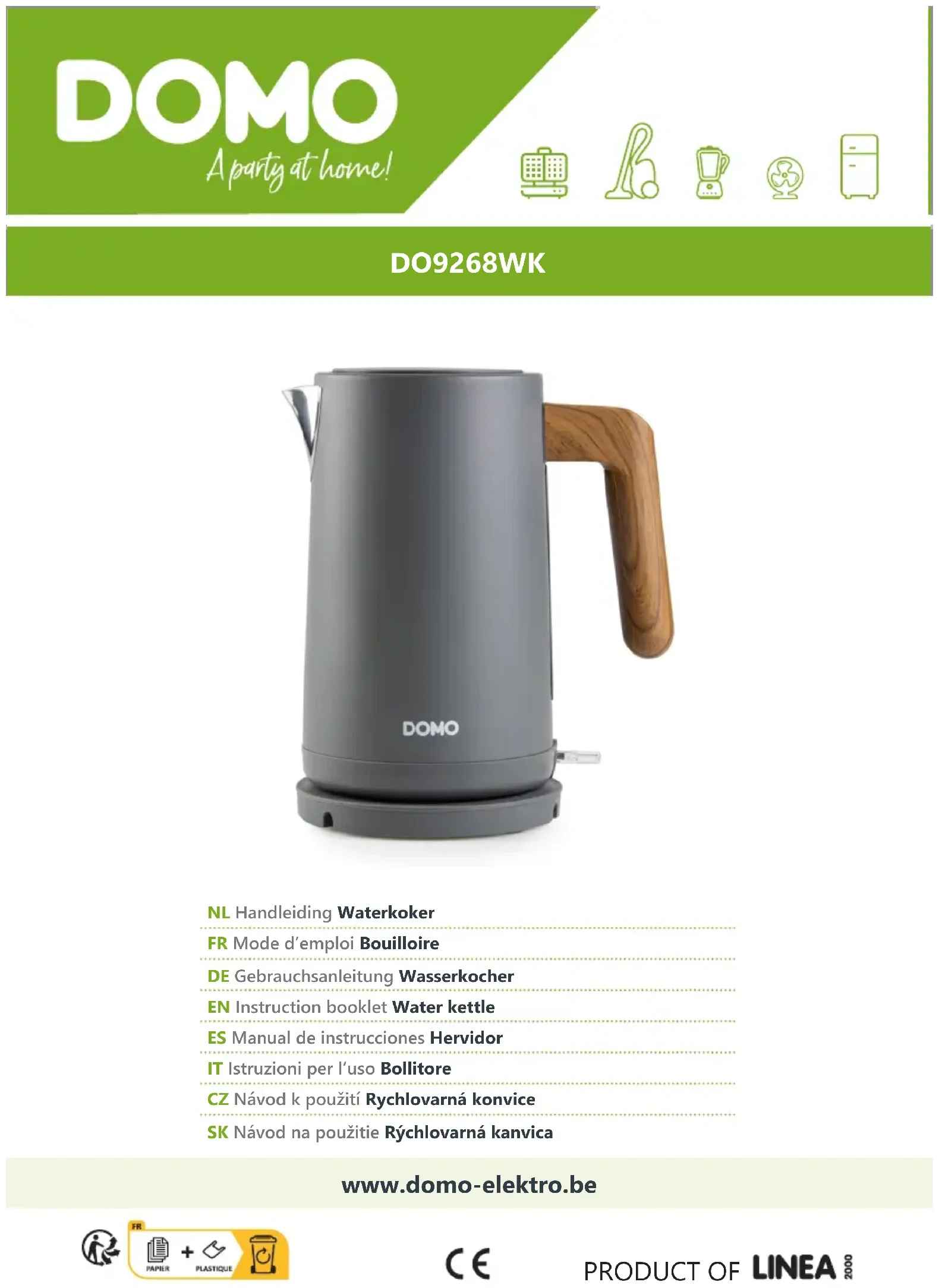 La bouilloire ne s’éteint pas automatiquement. Assurez-vous que l’interrupteur n’est pas obstrué et que le couvercle est bien fermé. Puis-je détartrer la bouilloire avec du vinaigre ? Oui, vous pouvez utiliser du vinaigre pour détartrer la bouilloire. Voir le chapitre relatif au détartrage. L’appareil s’éteint immédiatement. Si la quantité d’eau est trop faible (au moins 0,5 litre), la bouilloire s’éteindra d’elle-même avant que l’eau ne bouille. Si cette situation se présente, laissez d’abord la bouilloire refroidir avant de la remplir d’eau froide et de l’utiliser pour chauer l’eau. DIRECTIVES Ce symbole sur le produit ou son emballage indique que ce produit ne peut être traité comme déchet ménager. Il doit plutôt être remis au point de ramassage concerné, se chargeant du recyclage du matériel électrique et électronique. En vous assurant que ce produit est éliminé correctement, vous favorisez la prévention des conséquences négatives pour l’environnement et la santé humaine qui, sinon, seraient le résultat d’un traitement inapproprié des déchets de ce produit. Pour obtenir plus de détails sur le recyclage de ce produit, veuillez prendre contact avec le bureau municipal de votre région, votre service d’élimination des déchets ménagers ou le magasin où vous avez acheté le produit. L’emballage est recyclable. Traitez l’emballage écologiquement. Cet appareil est conforme à toutes les exigences européennes en matière de sécurité, de santé et de protection de l’environnement. La déclaration UE de cet appareil peut être demandée à tout moment à l’adresse suivante : info@linea2000.bewww.domo-elektro.be 17