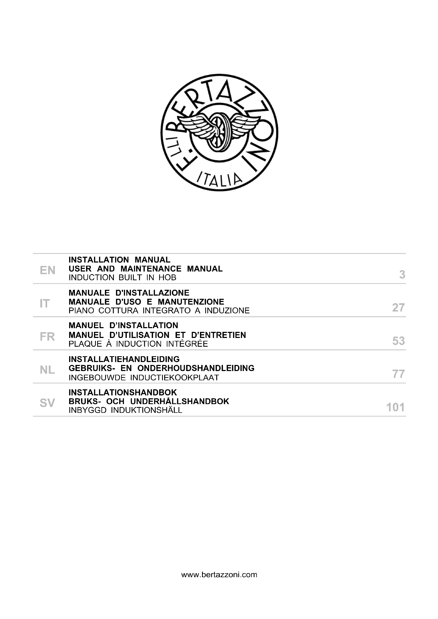 INFORMATIONS GÉNÉRALES DE SÉCURITÉ Cet appareil est conforme à la directive européenne 2012/19/UE (DEEE) Cet appareil est étiqueté conformément à la Directive européenne 2012/19/CE relative aux déchets d’équipements électriques et électroniques (DEEE). Cette directive contient les réglementations régissant la collecte et le recyclage des appareils hors service dans toute l’Union européenne. Le symbole d’une poubelle barrée d’une croix qui apparaît sur le produit indique que les Déchets d’Équipements Électriques et Électroniques (DEEE) ne doivent pas être jetés avec les déchets urbains ordinaires, mais doivent être éliminés séparément, afin de subir un traitement spécial pour permettre sa réutilisation ou un traitement spécifique pour l’enlèvement et l’élimination en toute sécurité de toute substance nocive pour l’environnement et l’extraction de matières premières recyclables. Par conséquent, les DEEE doivent être livrés aux centres de recyclage gérés par la municipalité ou des sociétés de gestion des déchets. En outre, lors de l’achat d’un nouvel appareil, les DEEE peuvent être confiés au revendeur, qui est tenu de le reprendre gratuitement (reprise « 1:1 »). Les « très petits » DEEE (dont la dimension n’excède pas 25 cm) peuvent être remis gratuitement aux commerçants même en l’absence d’achat (reprise « 0:1 » - qui n’est toutefois obligatoire que pour les magasins de plus de 400 m2). Bertazzoni SpaVia Palazzina, 842016 Guastalla (RE)Italywww.bertazzoni.com ATTENTION : This a p pl i ance mu s t b e i n s t all ed i n a c c o r d ance w i th t h e r egul ati o n s cu r rentl y i n f o r c e and m u s t b e o n l y u s ed i n w ell v ent i lated p r emises. Read t he in s tr u ct i on s b ef o r e i n s t all i n g o r u s i n g t hi s a pp l iance. PXXXXXXXXXXX Produc t Type : Inductio n Built-i n Hob Factor y Model:PXXXXXXXXXXX Rated Voltage : 220-24 0 V~ Rated Frequency : 50/6 0 Hz Tota l Powe r (kw ) : 7.0 k w (230v~) ; CLAS S I Made in Chin a